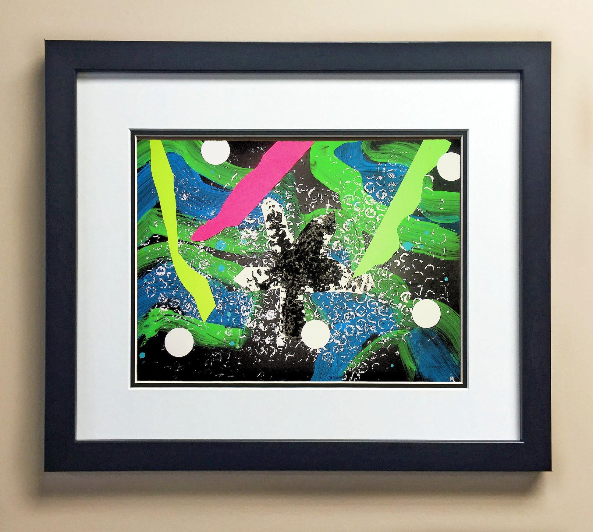 Included with the purchase is the Students Artwork, Frame, double matboard, shatter proof plexiglass, and a ready to hang backerboard with turnbuttons