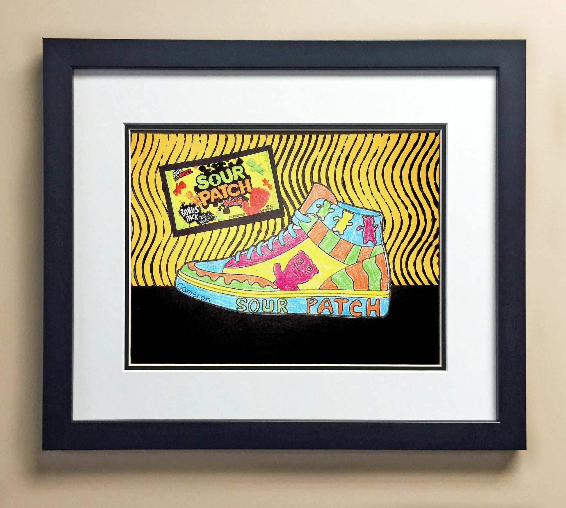 Included with the purchase is the Students Artwork, Frame, double matboard, shatter proof plexiglass, and a ready to hang backerboard with turnbuttons