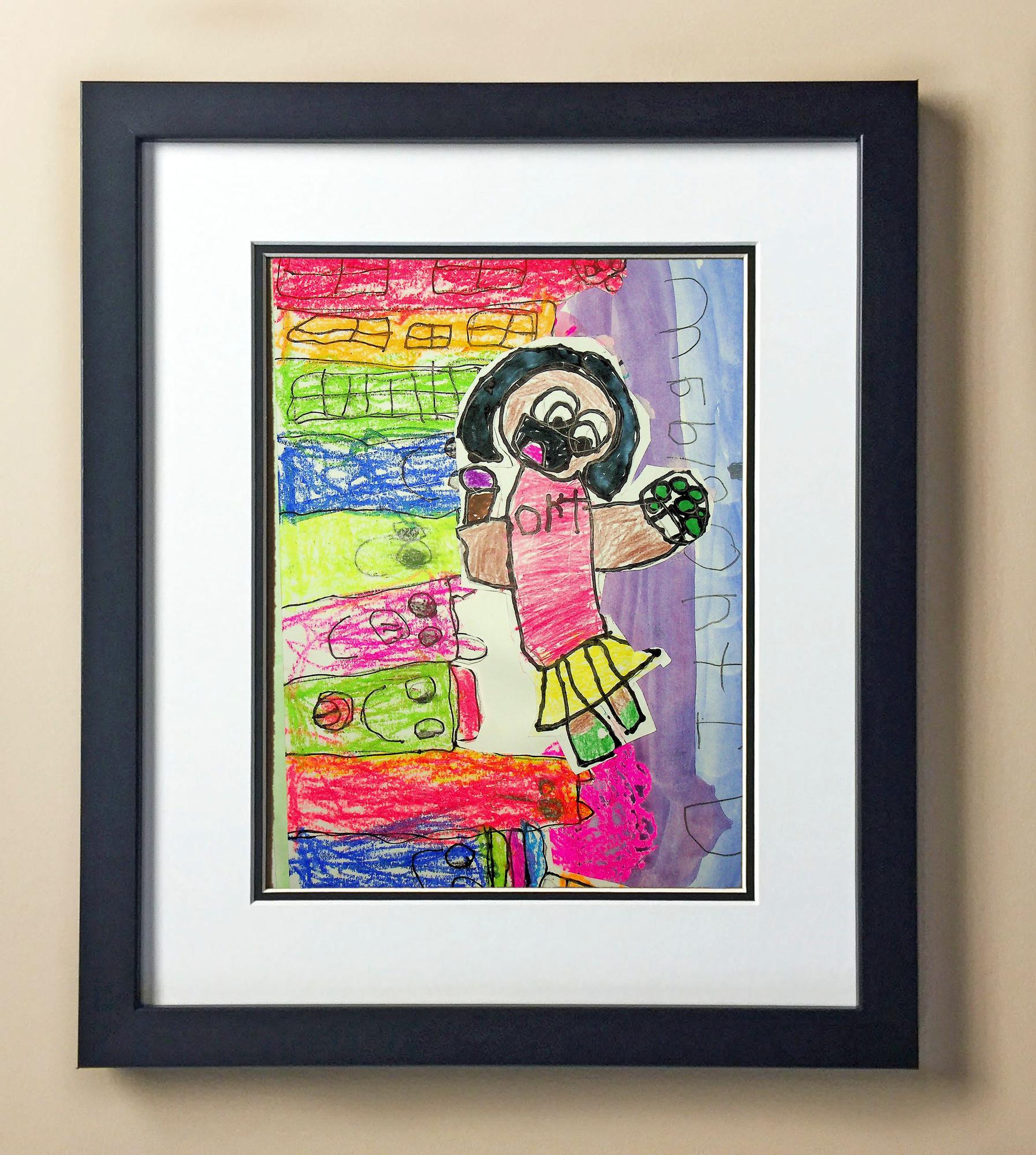 Included with the purchase is the Students Artwork, Frame, double matboard, shatter proof plexiglass, and a ready to hang backerboard with turnbuttons
