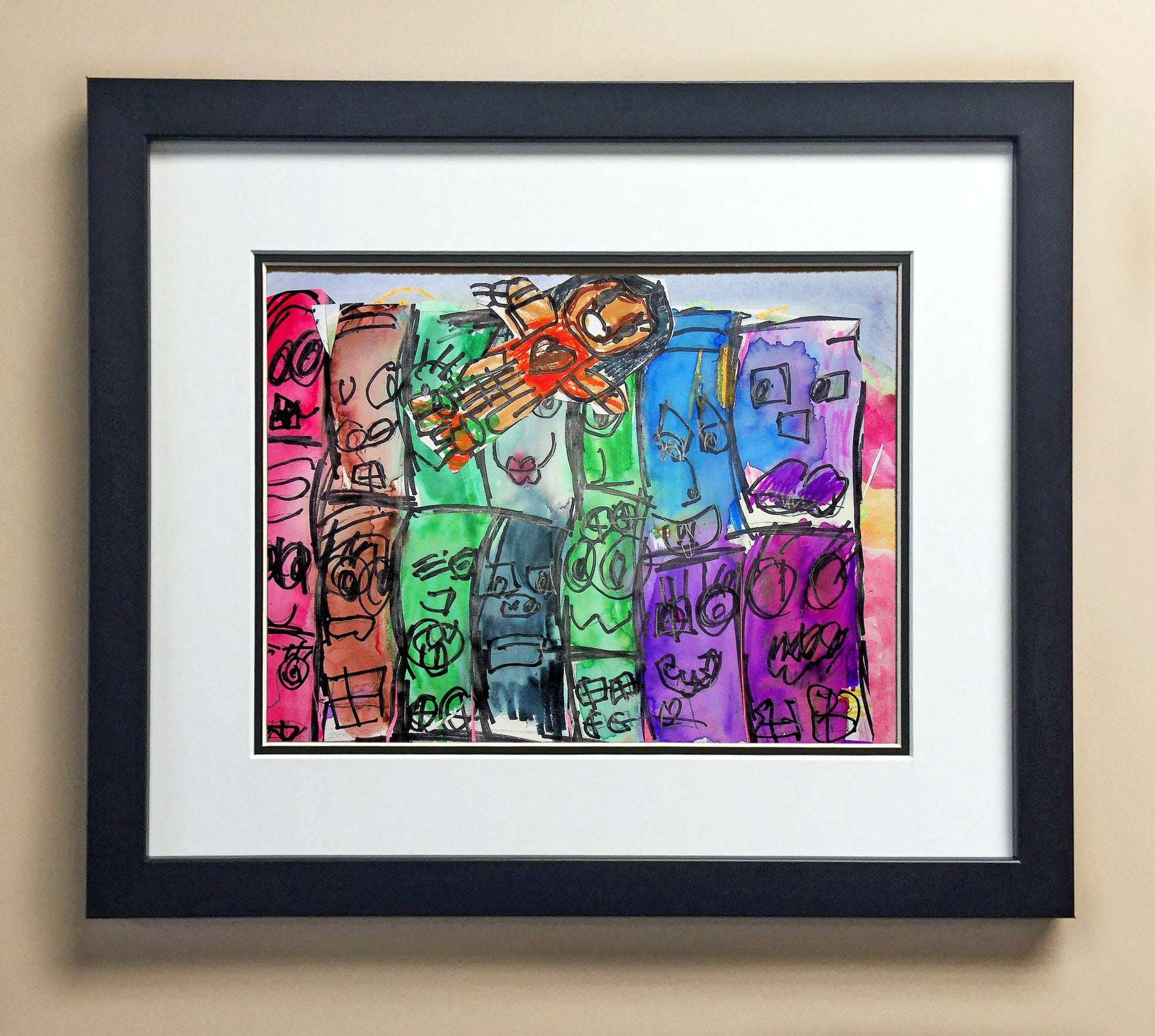 Included with the purchase is the Students Artwork, Frame, double matboard, shatter proof plexiglass, and a ready to hang backerboard with turnbuttons