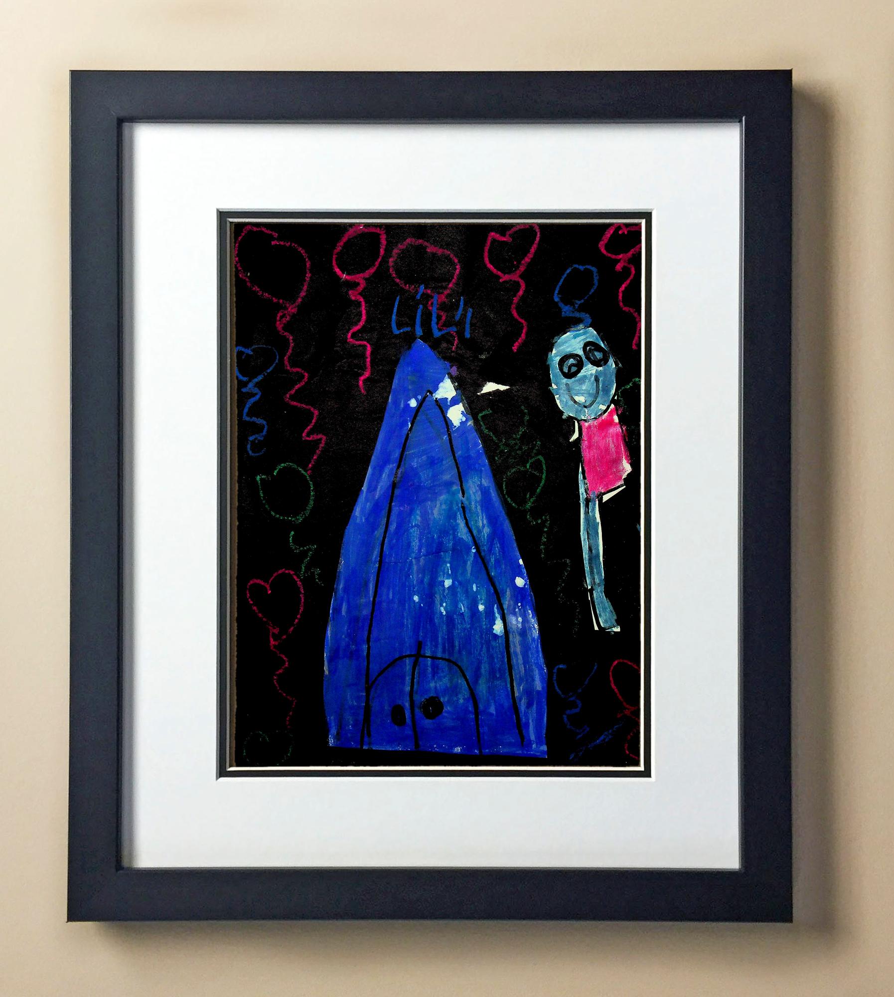 Included with the purchase is the Students Artwork, Frame, double matboard, shatter proof plexiglass, and a ready to hang backerboard with turnbuttons