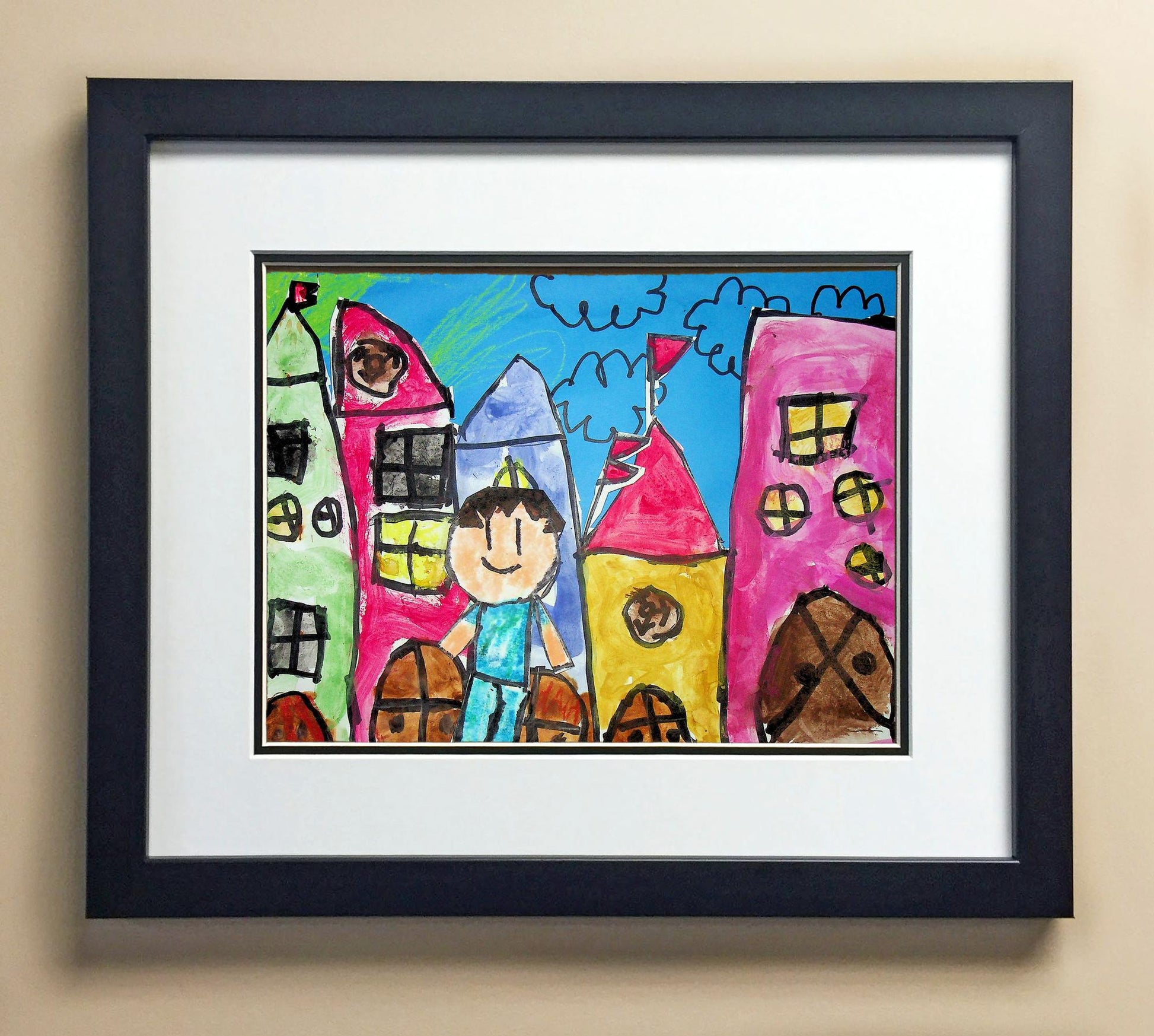 Included with the purchase is the Students Artwork, Frame, double matboard, shatter proof plexiglass, and a ready to hang backerboard with turnbuttons
