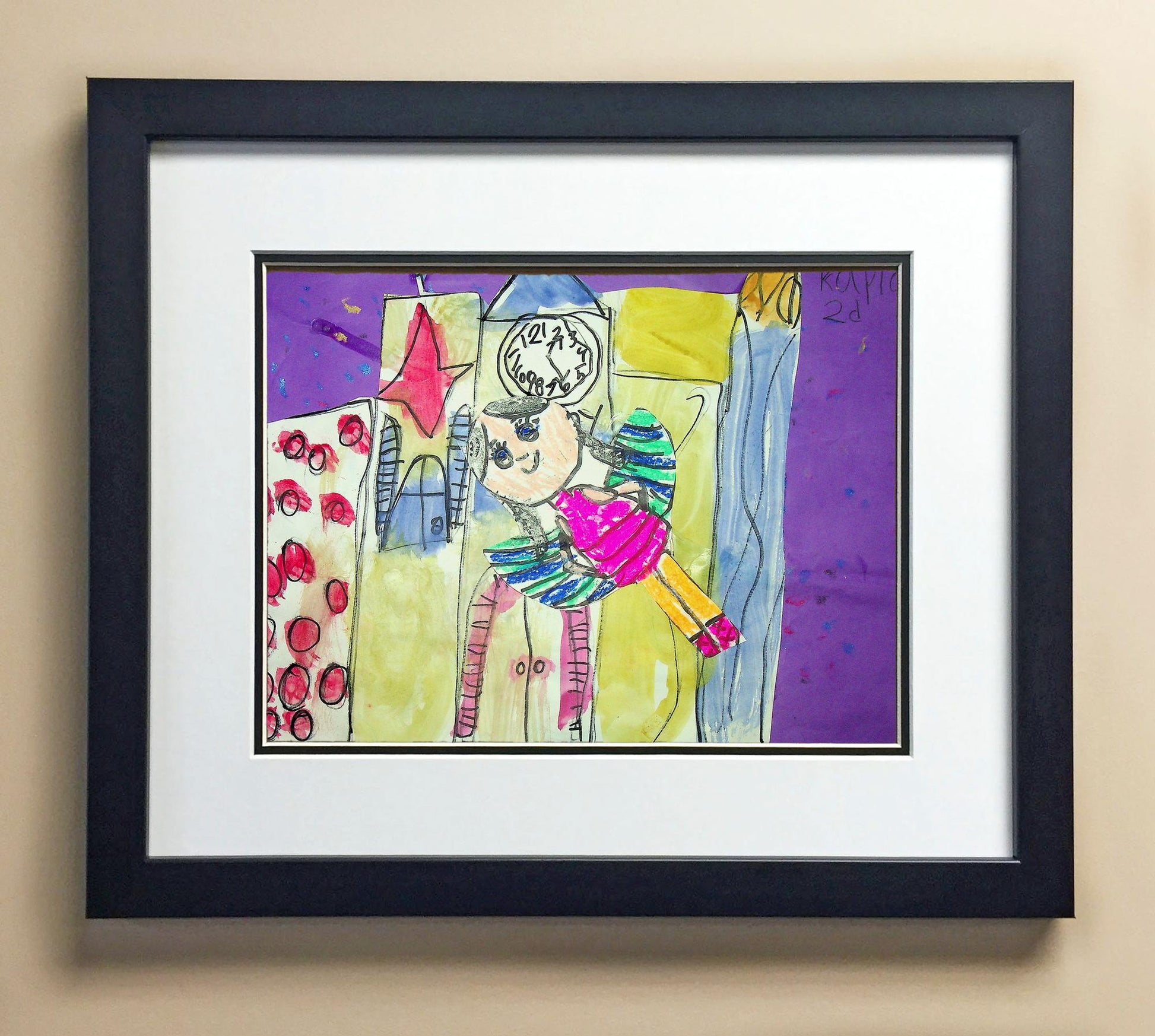 Included with the purchase is the Students Artwork, Frame, double matboard, shatter proof plexiglass, and a ready to hang backerboard with turnbuttons