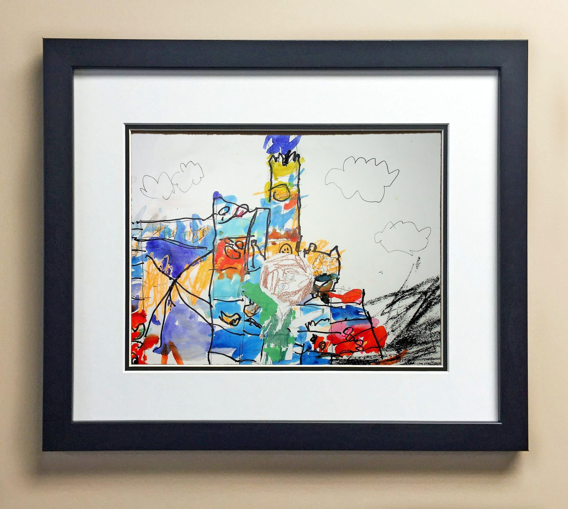 Included with the purchase is the Students Artwork, Frame, double matboard, shatter proof plexiglass, and a ready to hang backerboard with turnbuttons