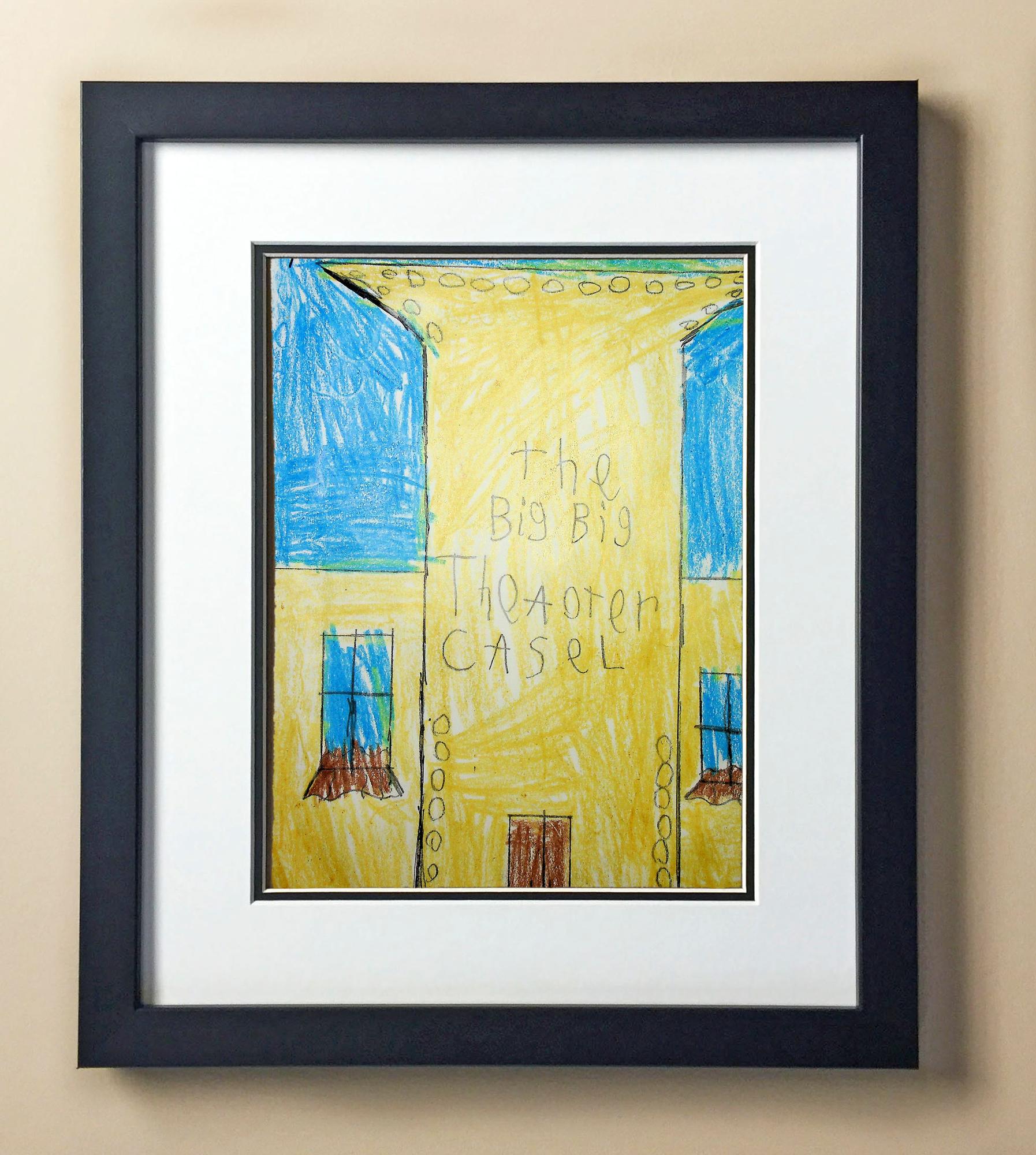 Included with the purchase is the Students Artwork, Frame, double matboard, shatter proof plexiglass, and a ready to hang backerboard with turnbuttons