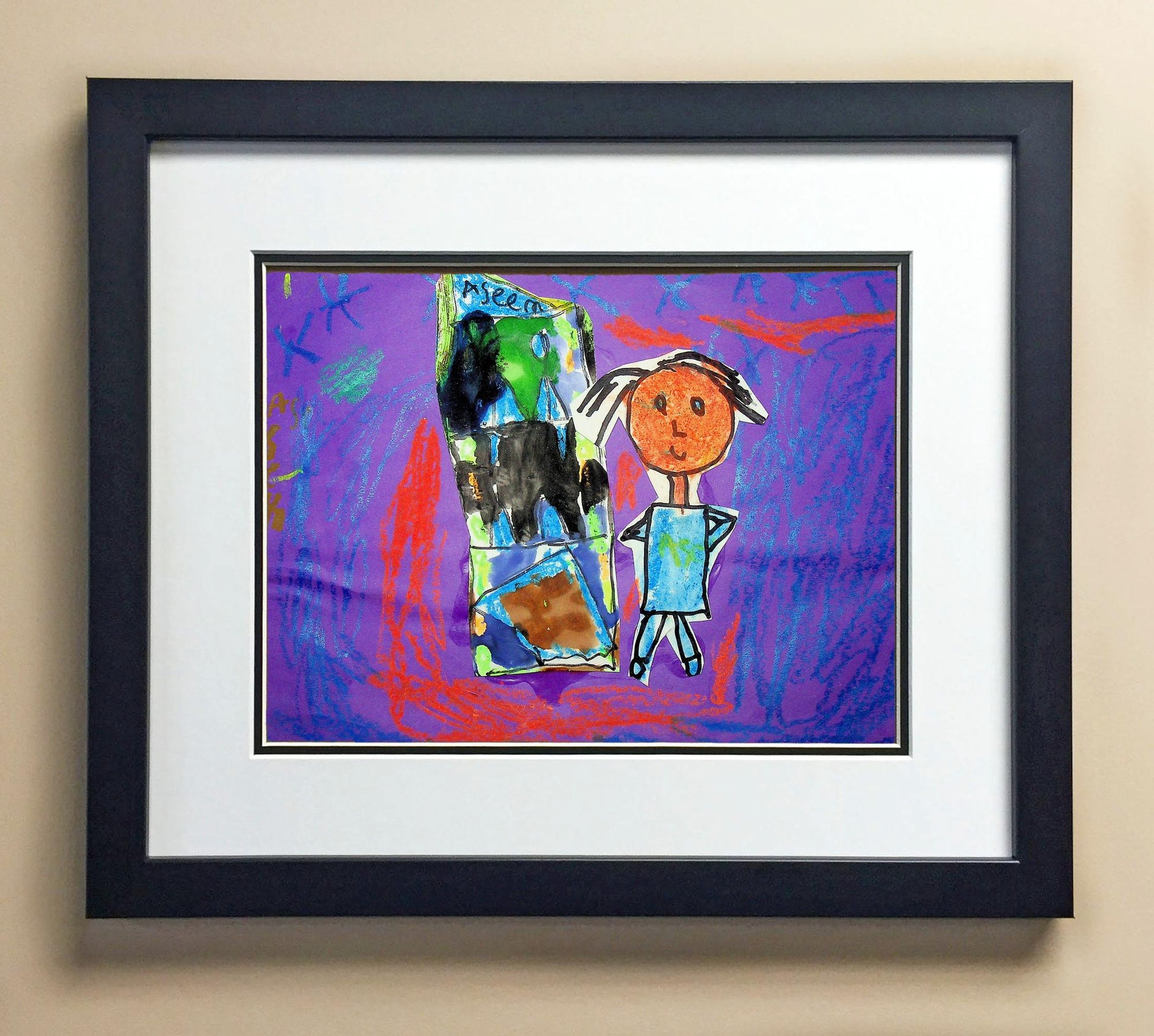 Included with the purchase is the Students Artwork, Frame, double matboard, shatter proof plexiglass, and a ready to hang backerboard with turnbuttons