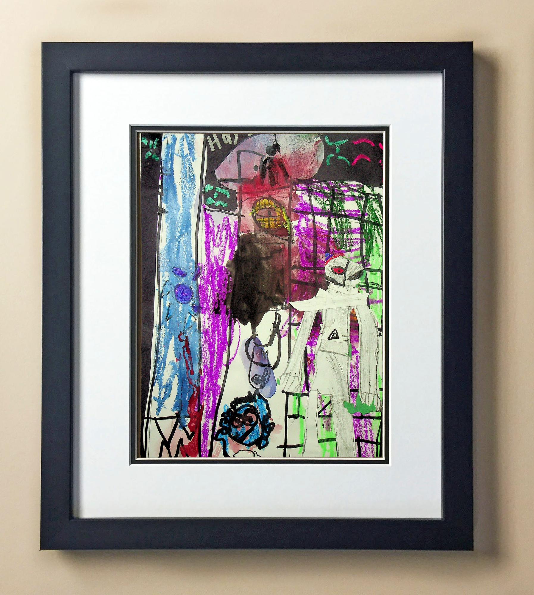 Included with the purchase is the Students Artwork, Frame, double matboard, shatter proof plexiglass, and a ready to hang backerboard with turnbuttons