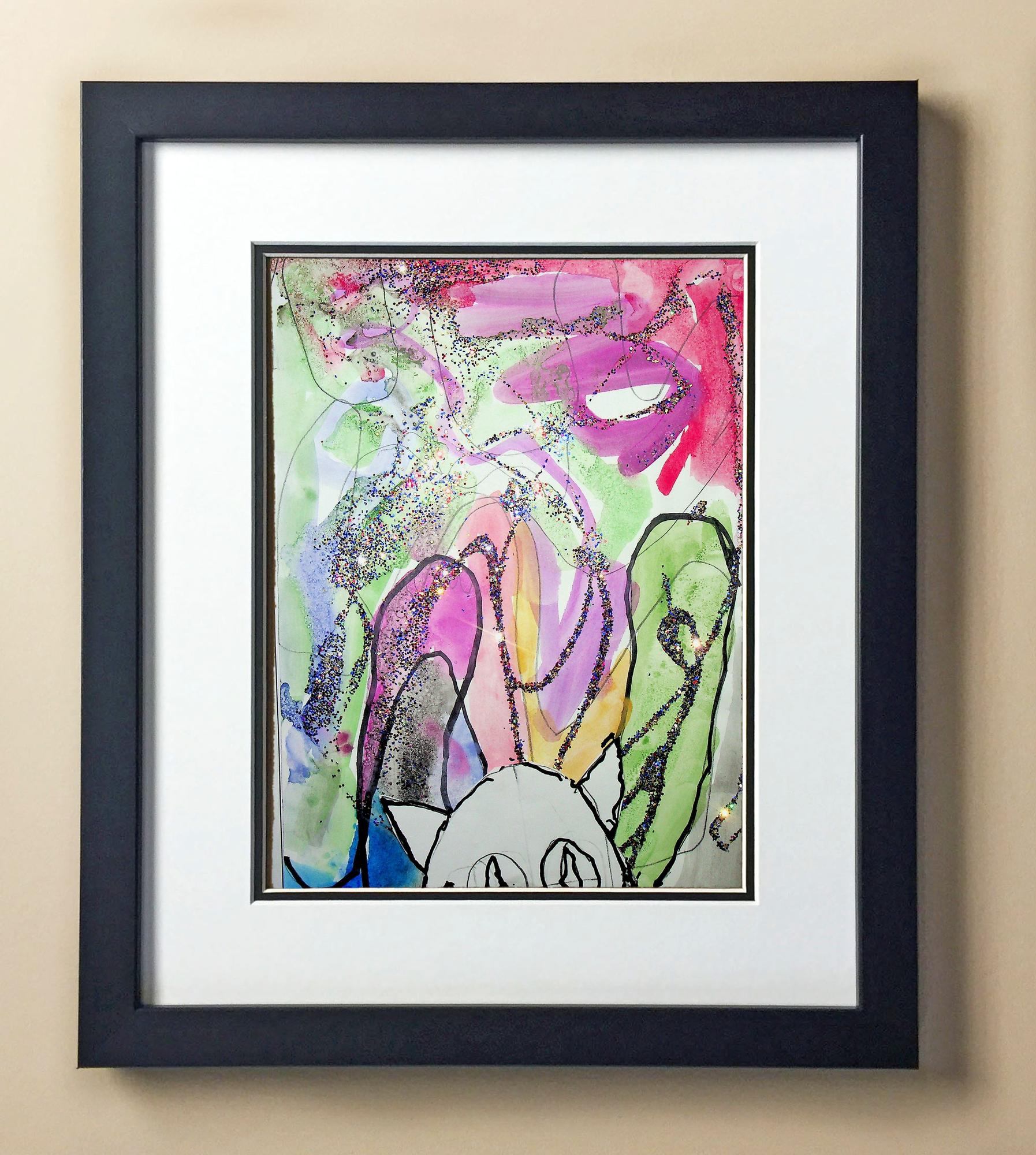 Included with the purchase is the Students Artwork, Frame, double matboard, shatter proof plexiglass, and a ready to hang backerboard with turnbuttons