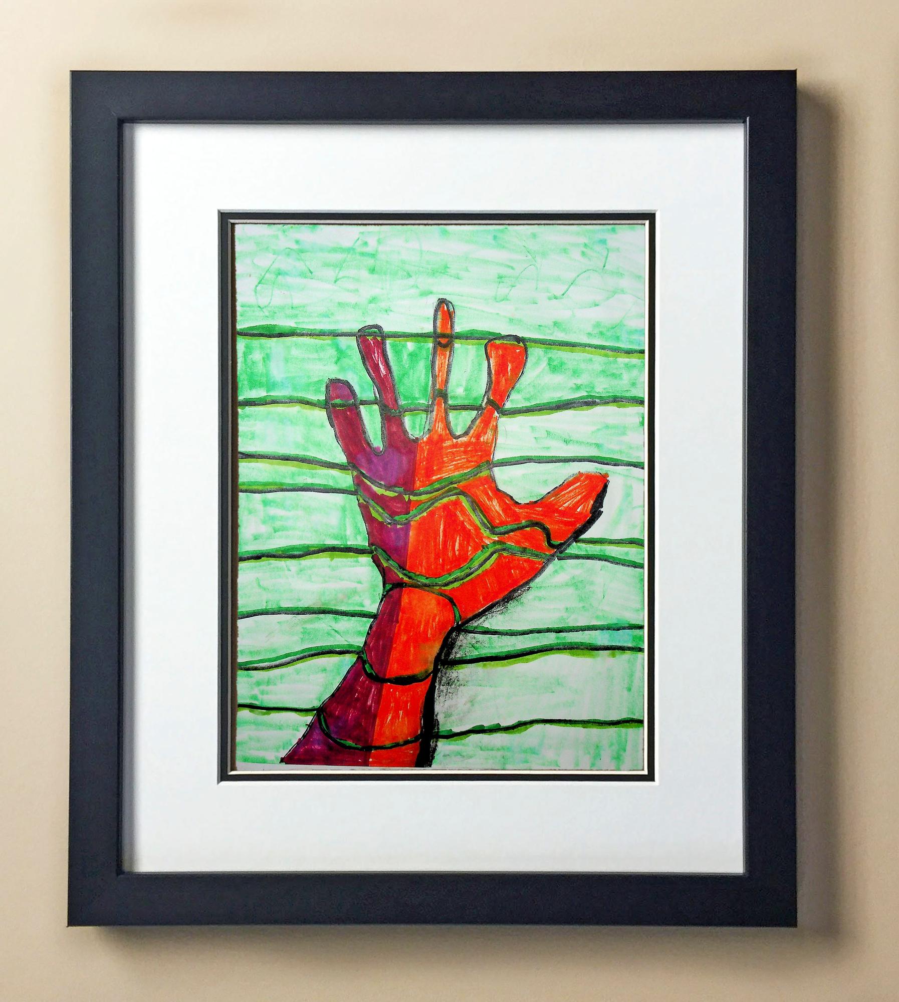 Included with the purchase is the Students Artwork, Frame, double matboard, shatter proof plexiglass, and a ready to hang backerboard with turnbuttons