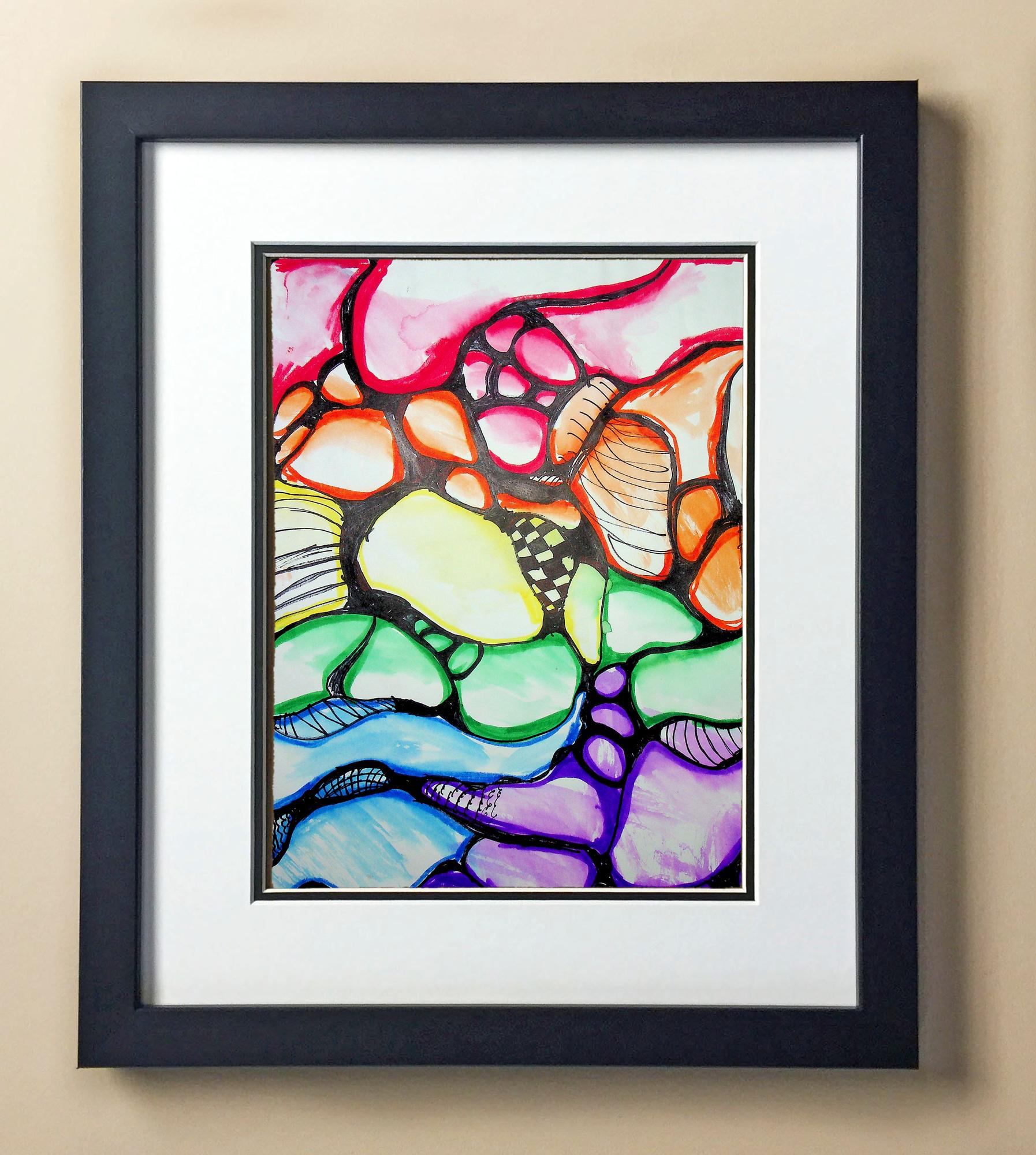 Included with the purchase is the Students Artwork, Frame, double matboard, shatter proof plexiglass, and a ready to hang backerboard with turnbuttons