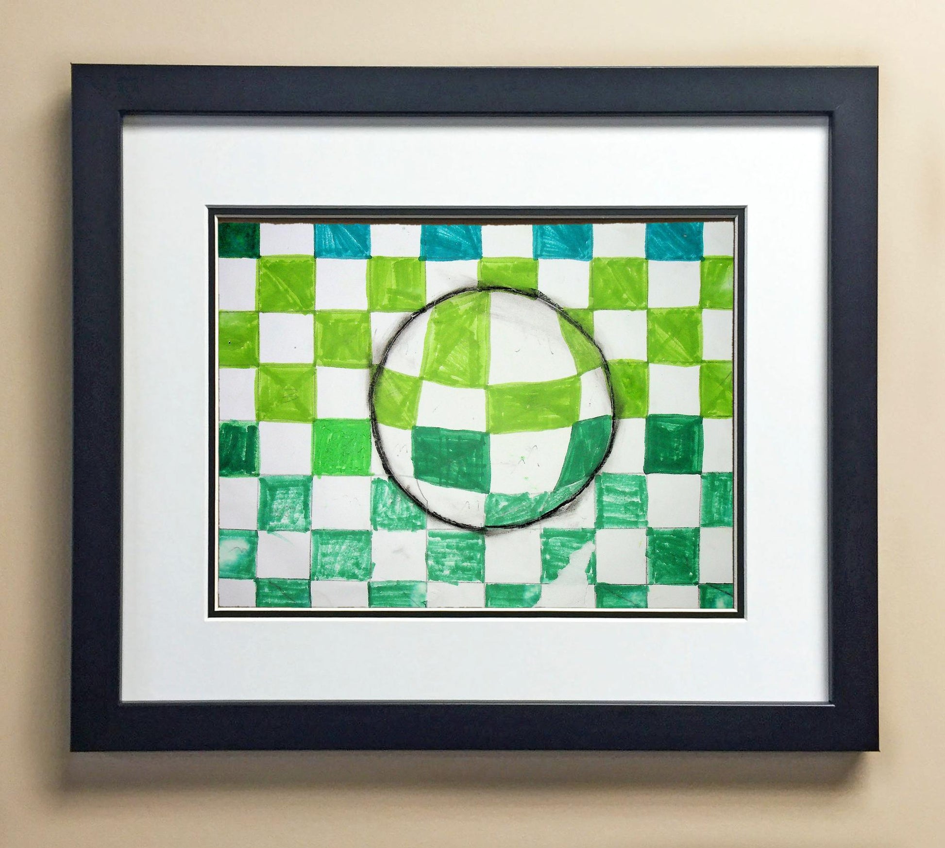 Included with the purchase is the Students Artwork, Frame, double matboard, shatter proof plexiglass, and a ready to hang backerboard with turnbuttons