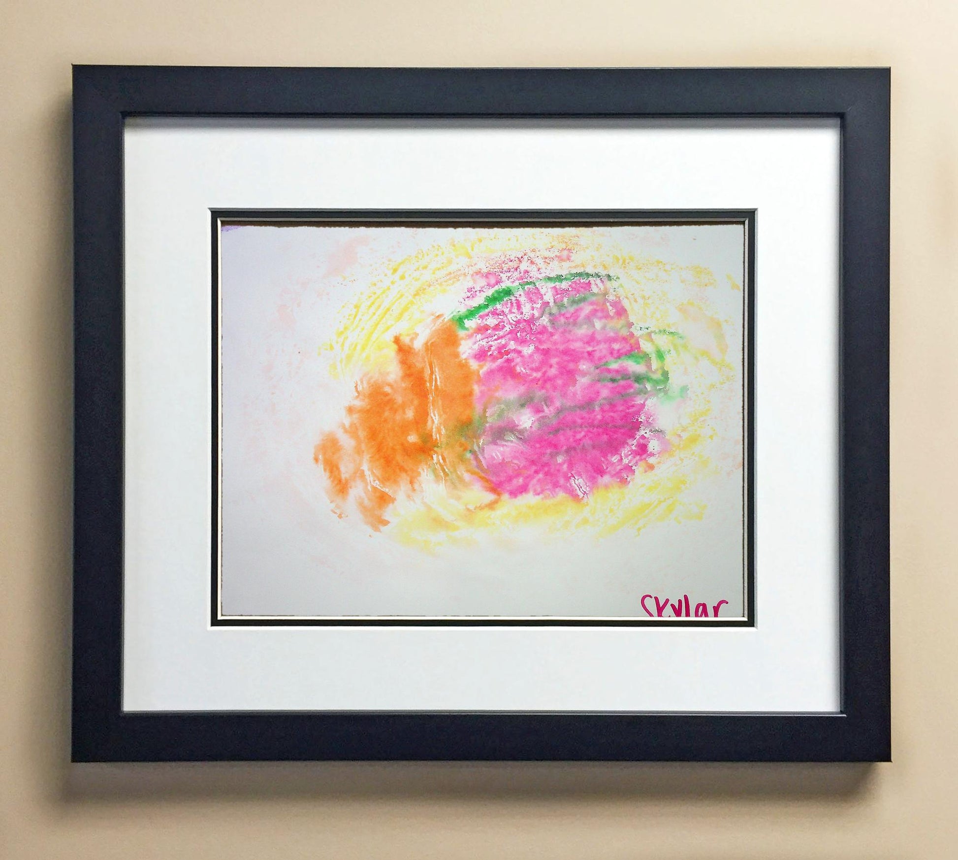 Included with the purchase is the Students Artwork, Frame, double matboard, shatter proof plexiglass, and a ready to hang backerboard with turnbuttons