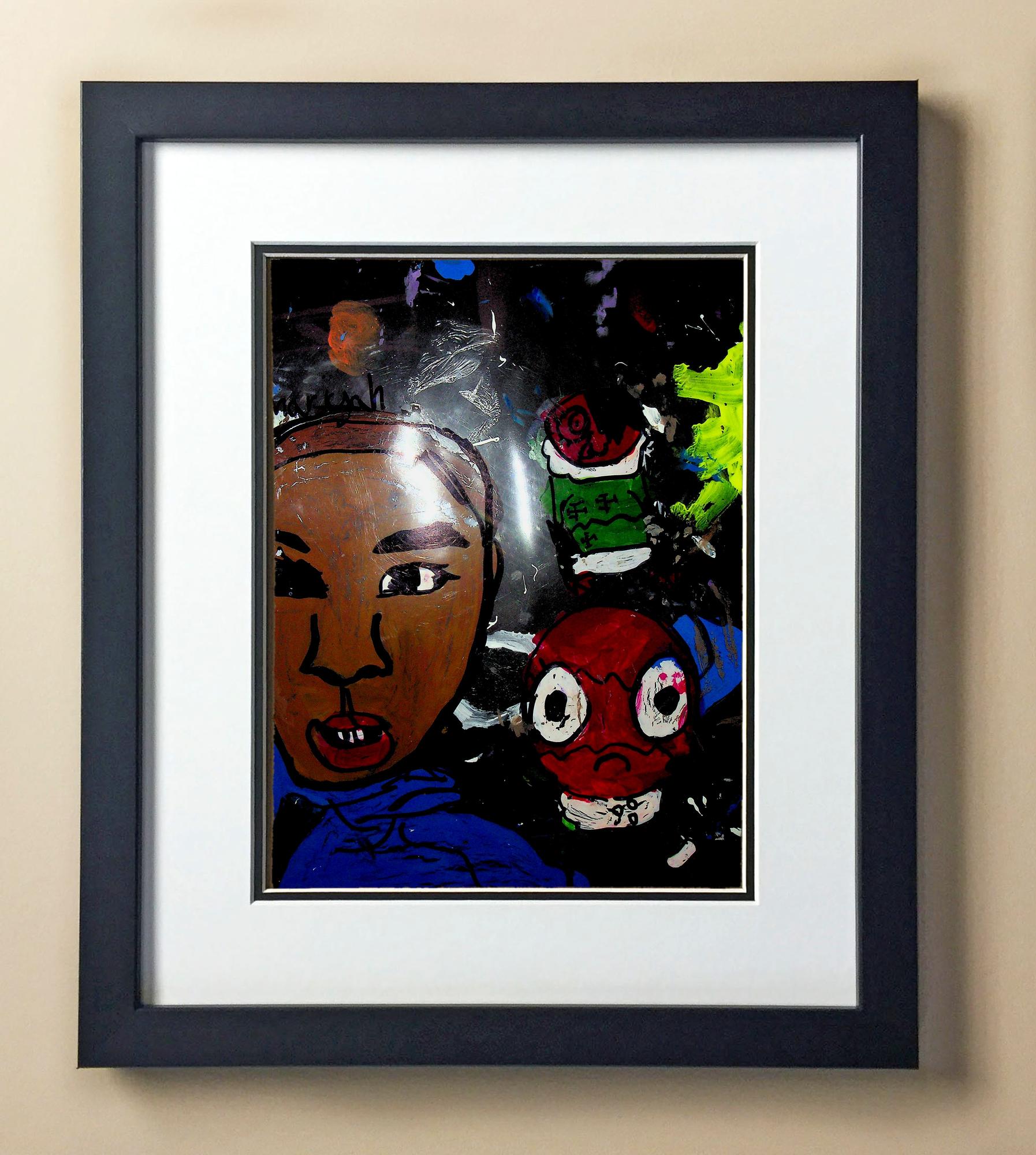 Included with the purchase is the Students Artwork, Frame, double matboard, shatter proof plexiglass, and a ready to hang backerboard with turnbuttons