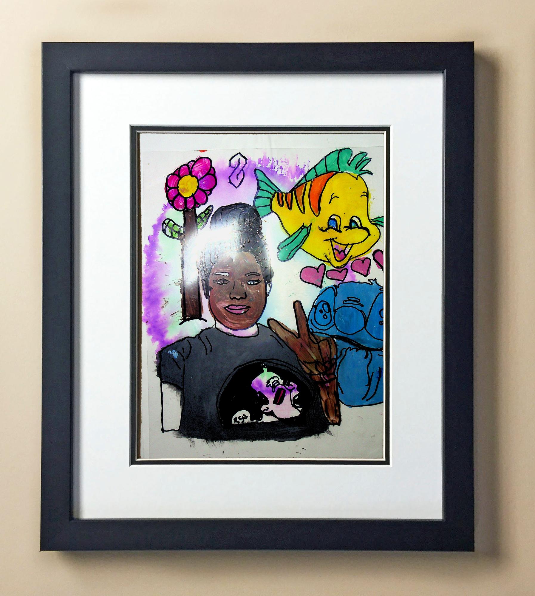 Included with the purchase is the Students Artwork, Frame, double matboard, shatter proof plexiglass, and a ready to hang backerboard with turnbuttons