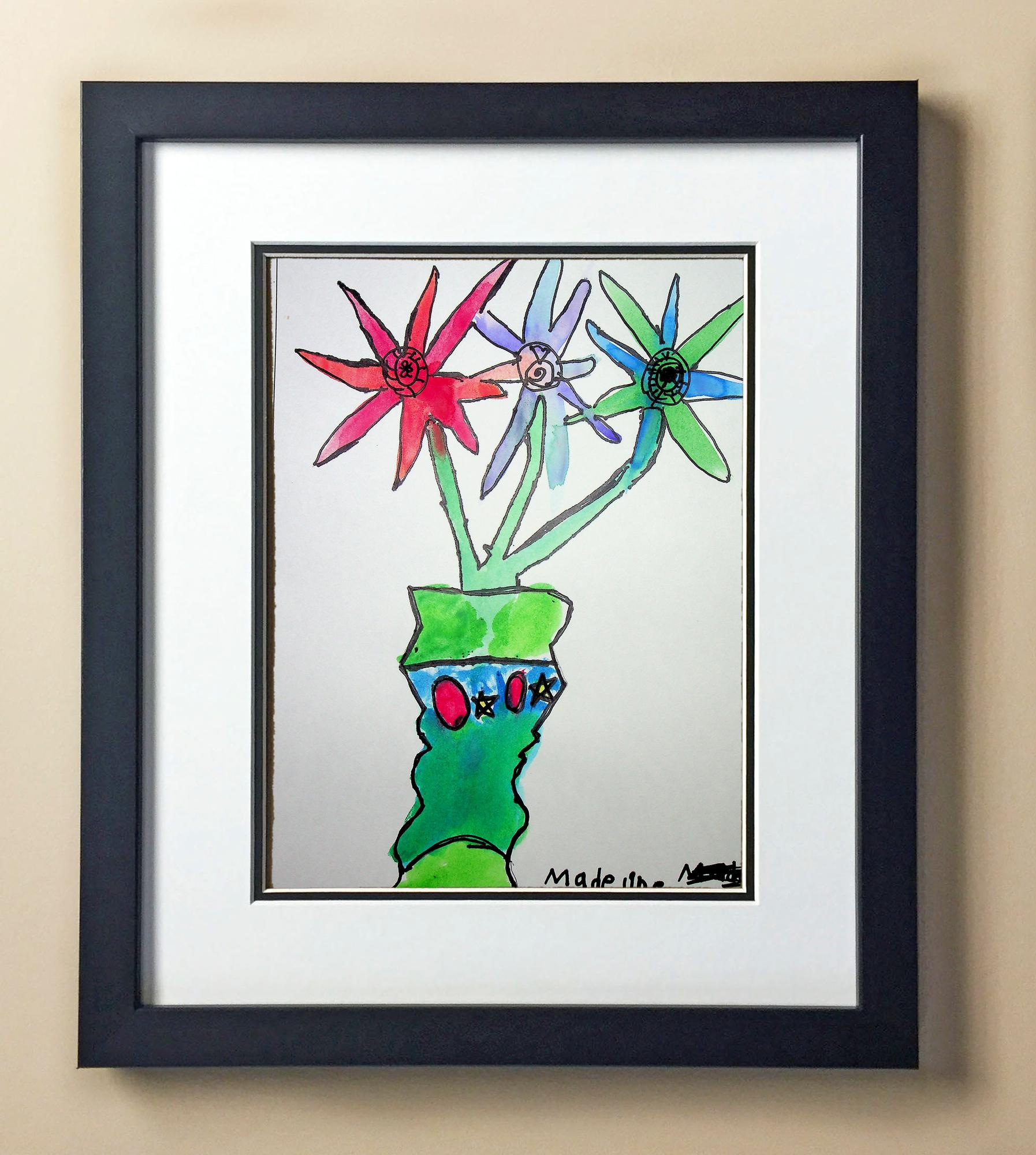 Included with the purchase is the Students Artwork, Frame, double matboard, shatter proof plexiglass, and a ready to hang backerboard with turnbuttons