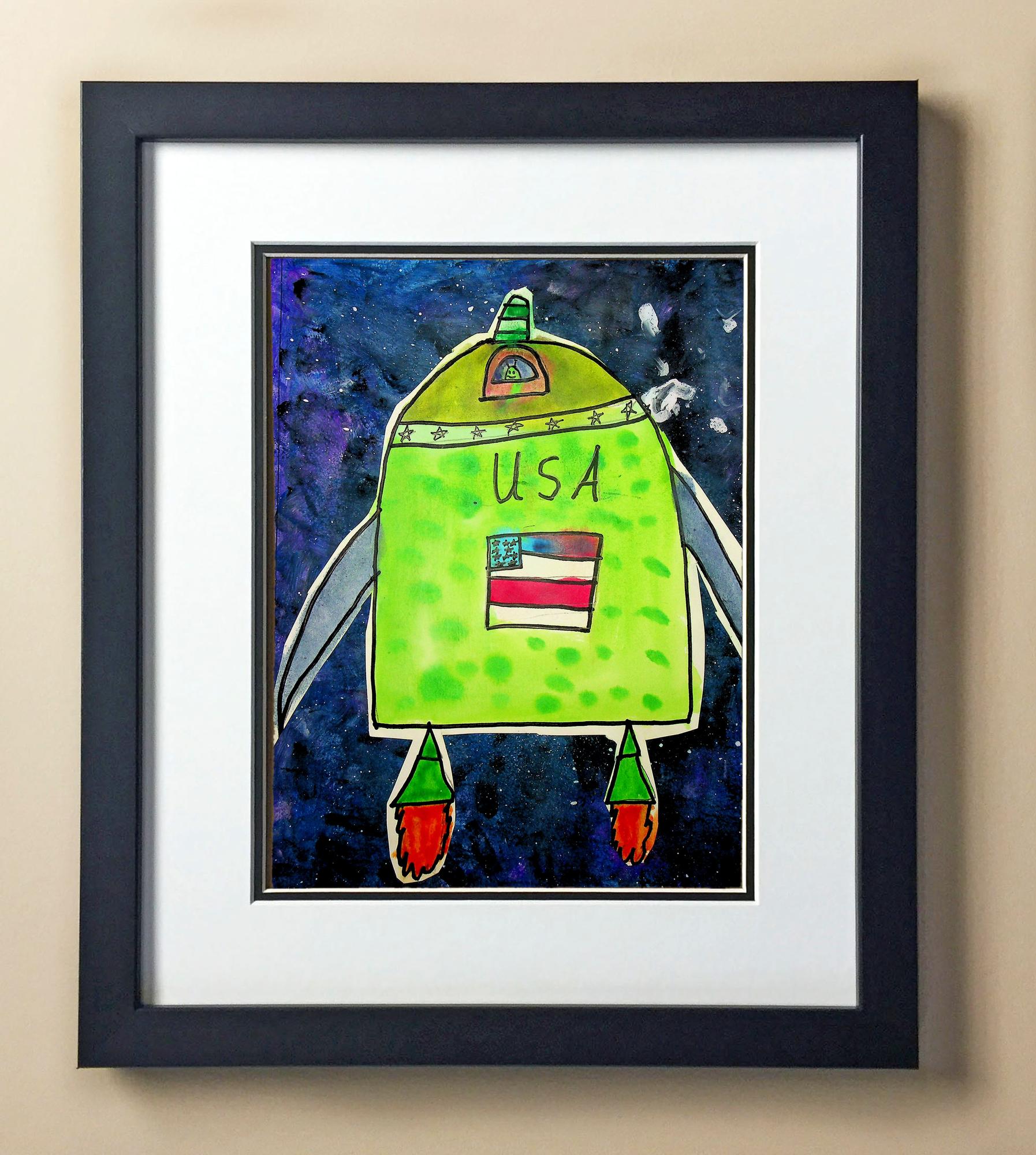 Included with the purchase is the Students Artwork, Frame, double matboard, shatter proof plexiglass, and a ready to hang backerboard with turnbuttons