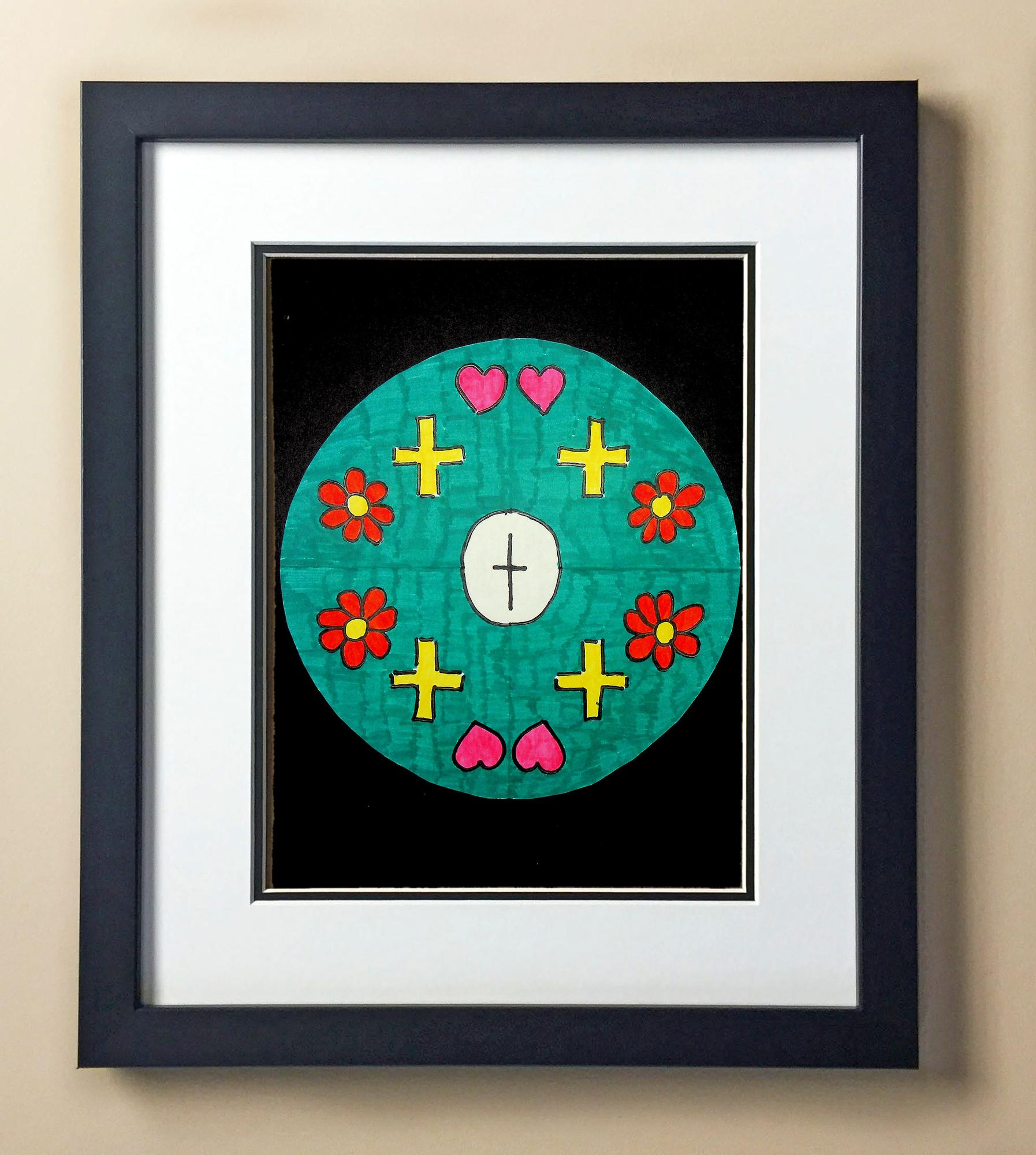 Included with the purchase is the Students Artwork, Frame, double matboard, shatter proof plexiglass, and a ready to hang backerboard with turnbuttons