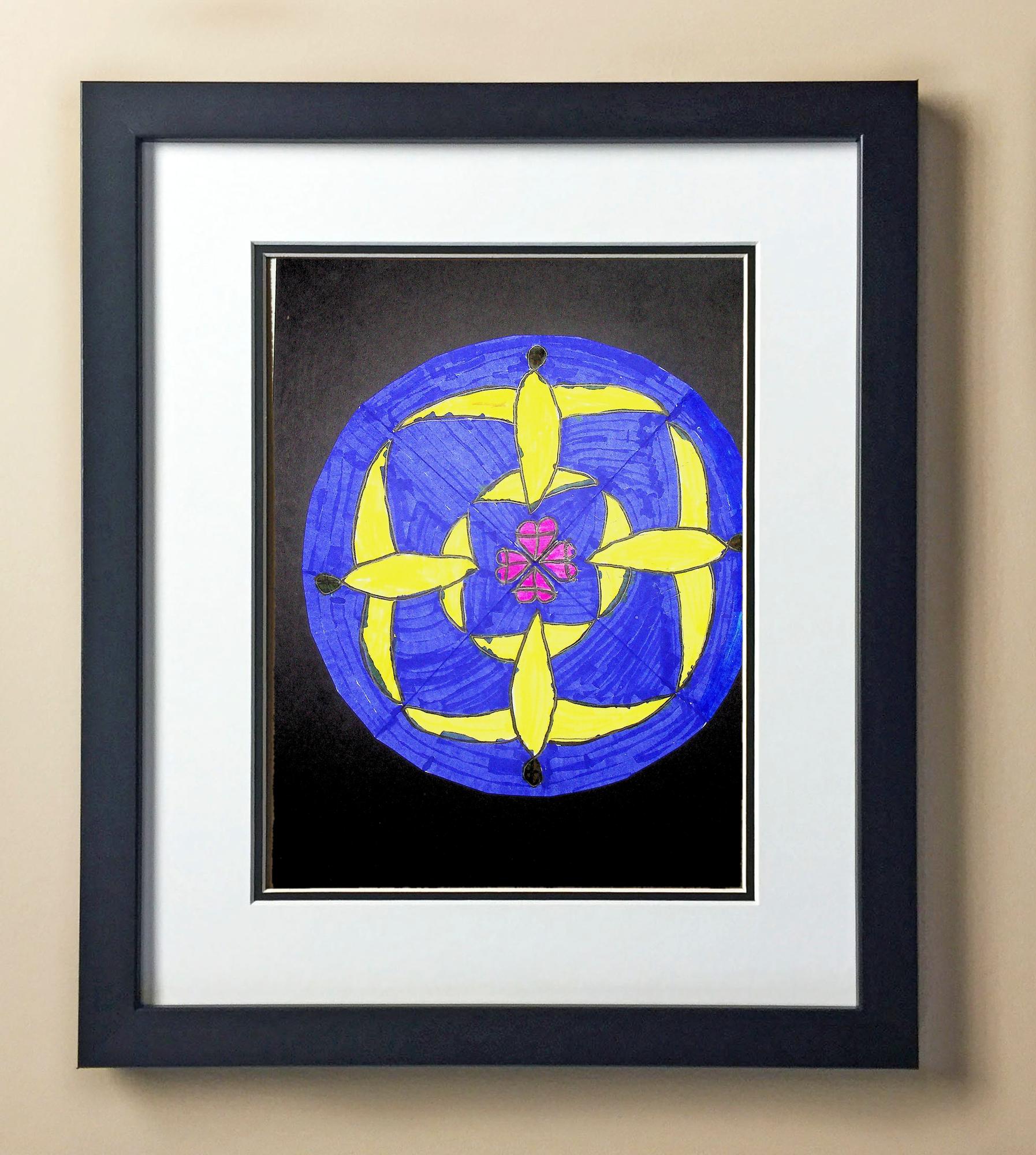 Included with the purchase is the Students Artwork, Frame, double matboard, shatter proof plexiglass, and a ready to hang backerboard with turnbuttons