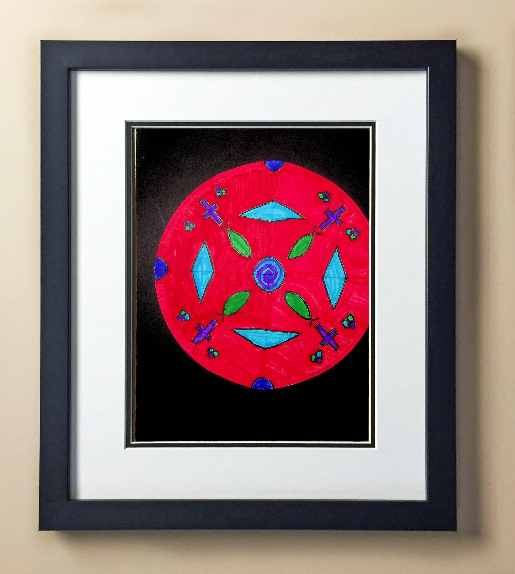 Included with the purchase is the Students Artwork, Frame, double matboard, shatter proof plexiglass, and a ready to hang backerboard with turnbuttons