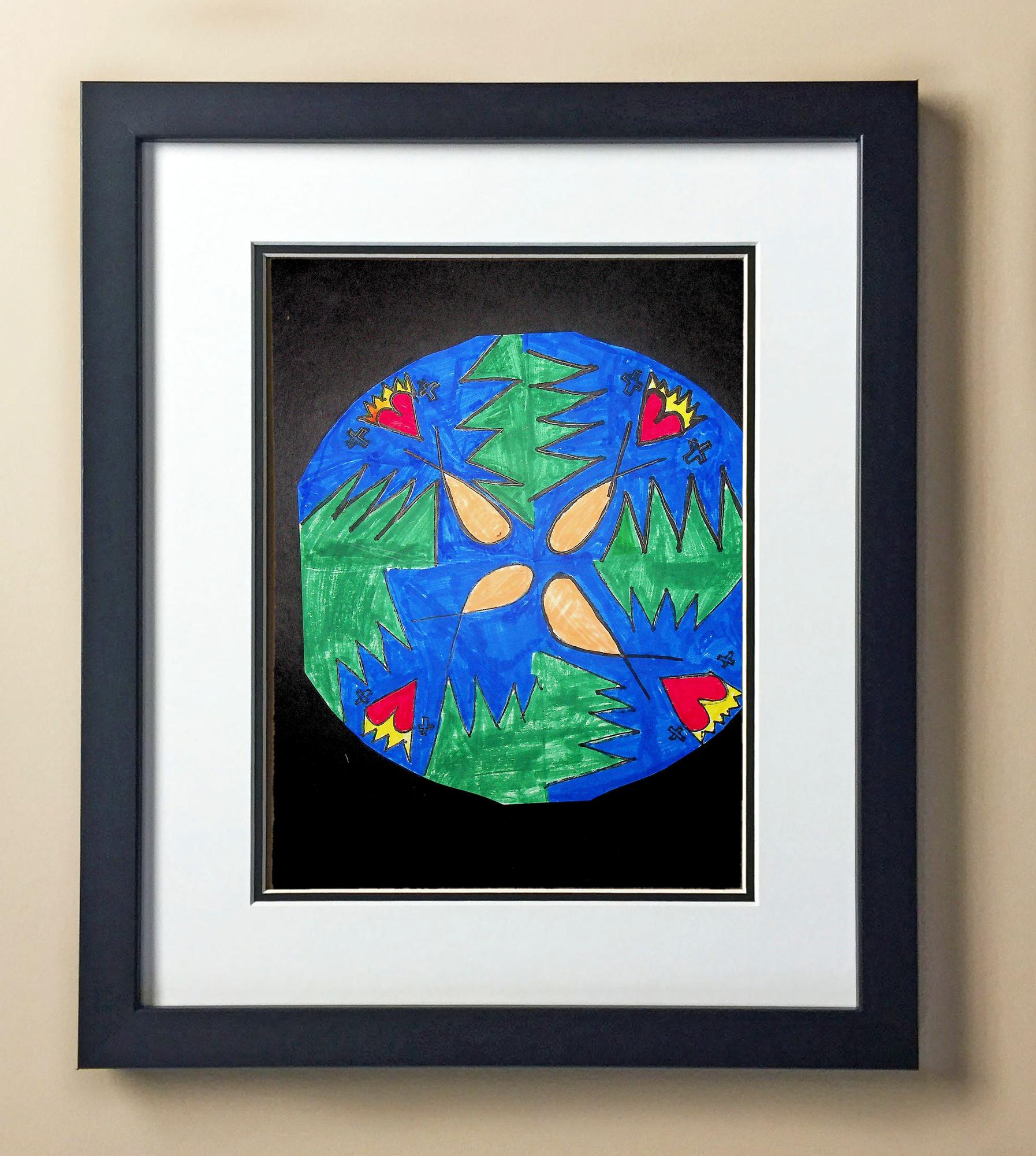 Included with the purchase is the Students Artwork, Frame, double matboard, shatter proof plexiglass, and a ready to hang backerboard with turnbuttons