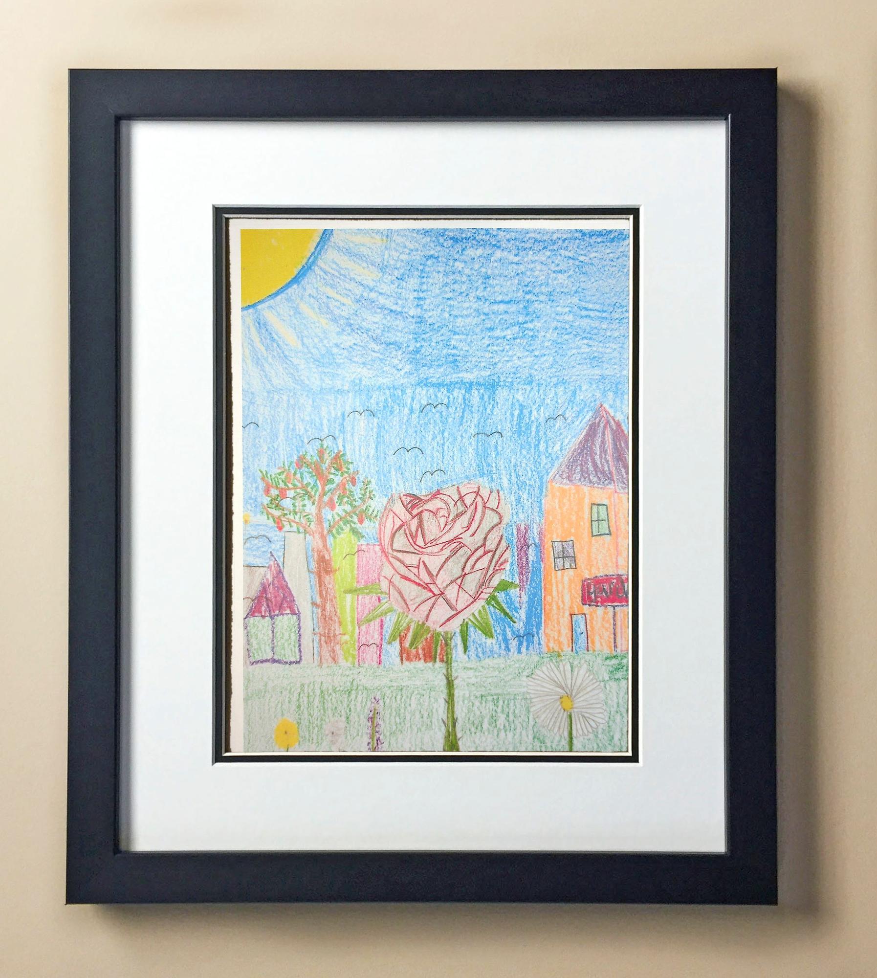 Included with the purchase is the Students Artwork, Frame, double matboard, shatter proof plexiglass, and a ready to hang backerboard with turnbuttons