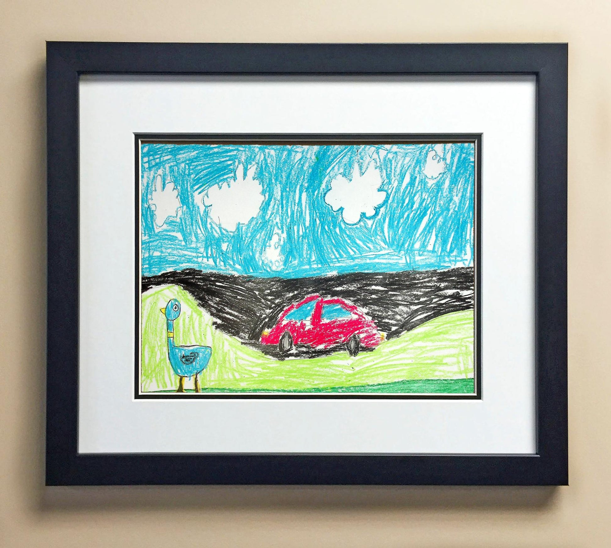 Included with the purchase is the Students Artwork, Frame, double matboard, shatter proof plexiglass, and a ready to hang backerboard with turnbuttons