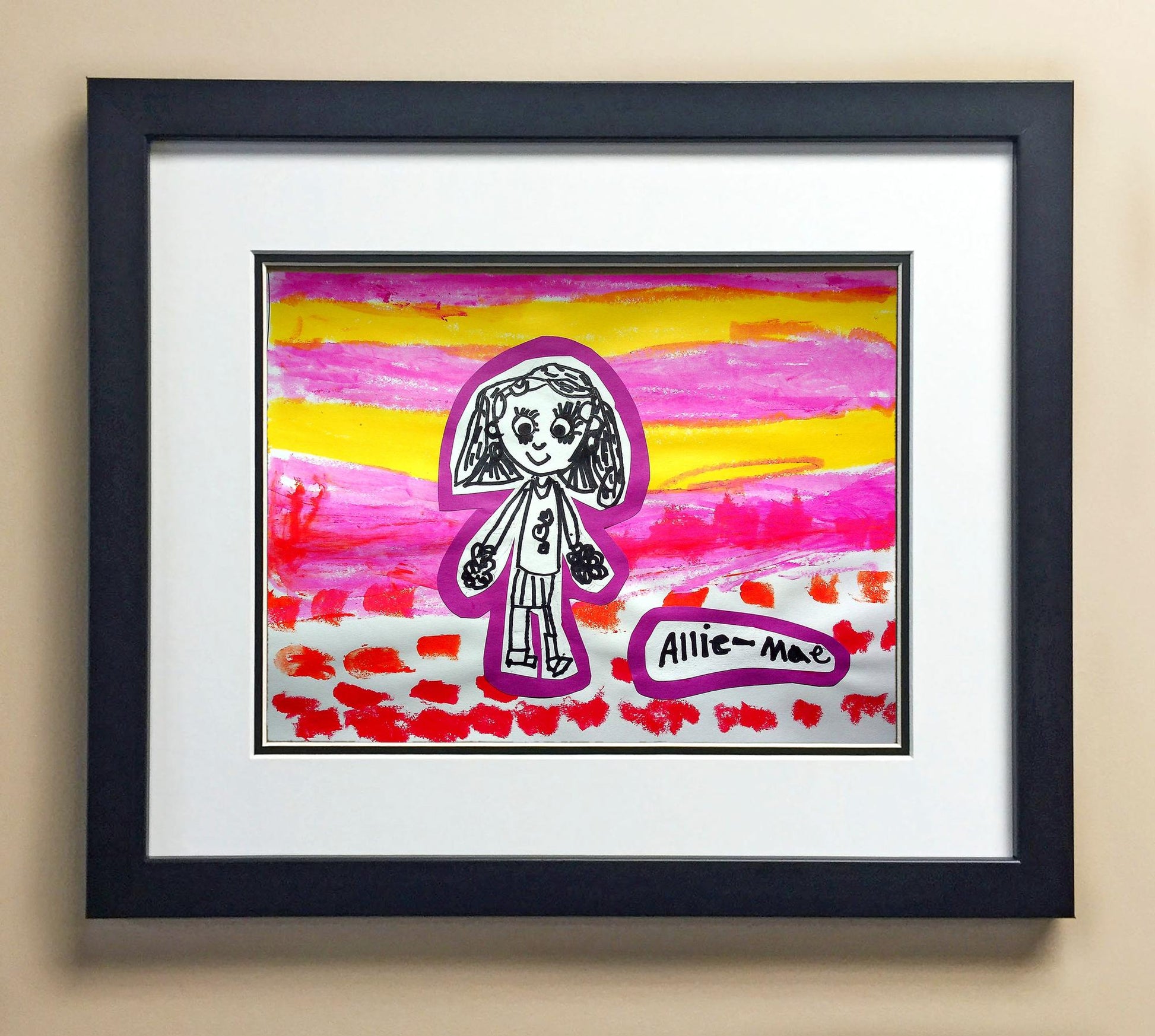 Included with the purchase is the Students Artwork, Frame, double matboard, shatter proof plexiglass, and a ready to hang backerboard with turnbuttons