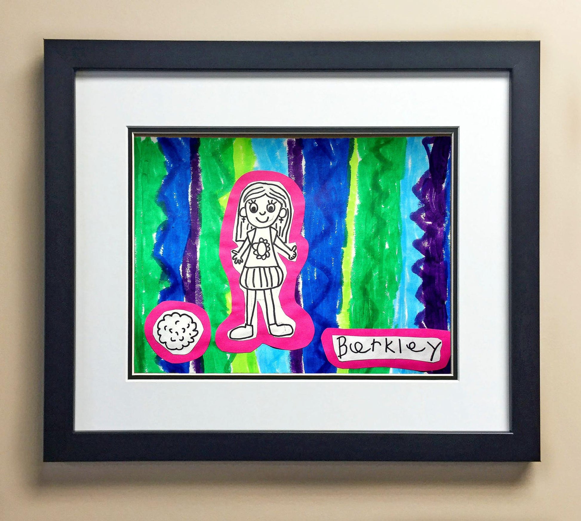 Included with the purchase is the Students Artwork, Frame, double matboard, shatter proof plexiglass, and a ready to hang backerboard with turnbuttons