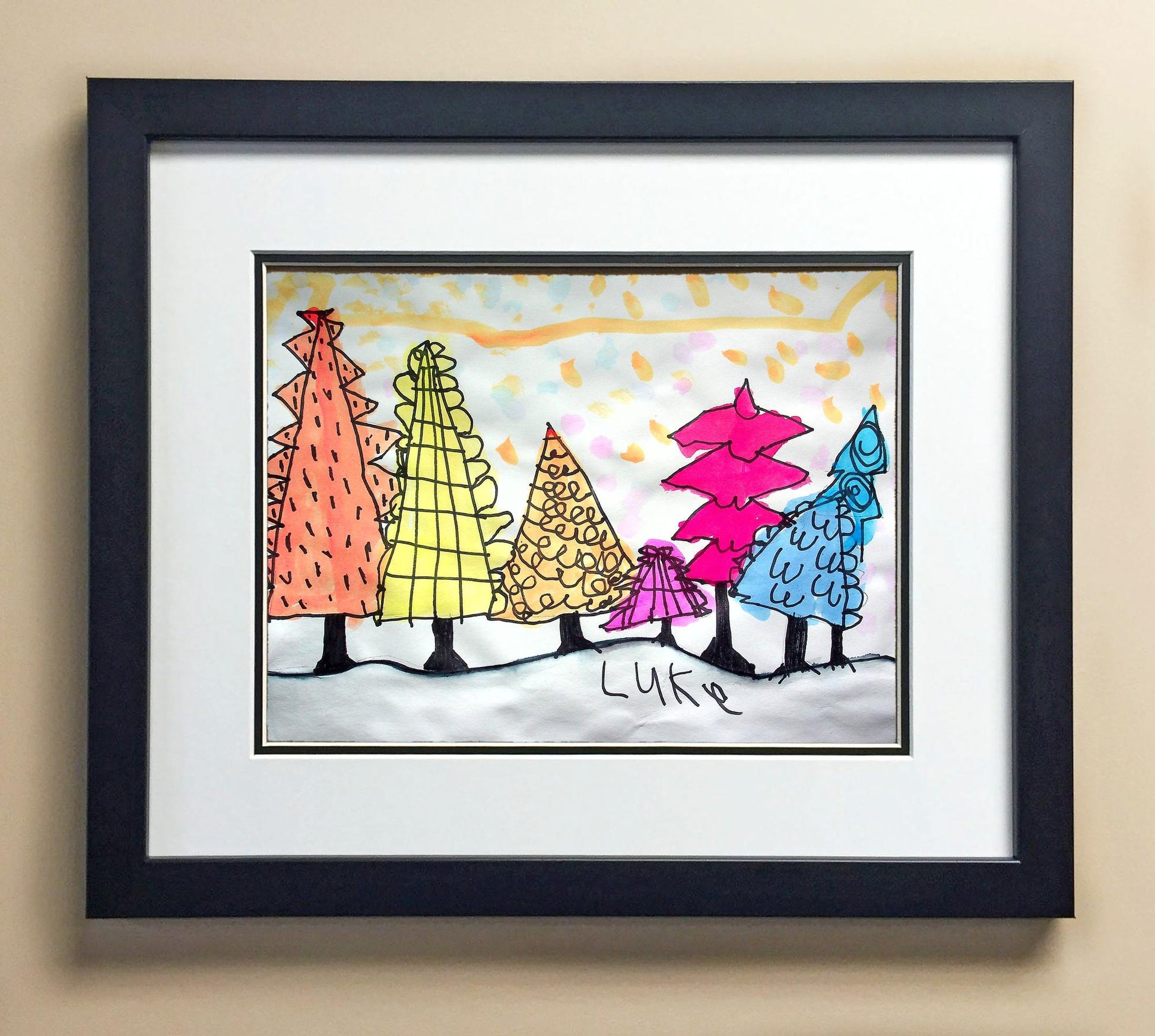 Included with the purchase is the Students Artwork, Frame, double matboard, shatter proof plexiglass, and a ready to hang backerboard with turnbuttons