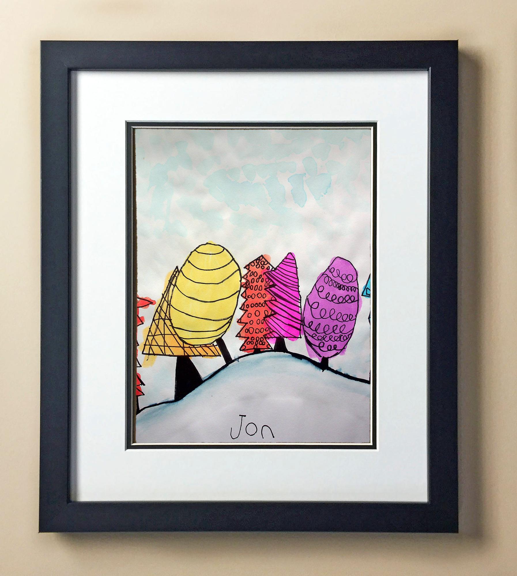 Included with the purchase is the Students Artwork, Frame, double matboard, shatter proof plexiglass, and a ready to hang backerboard with turnbuttons