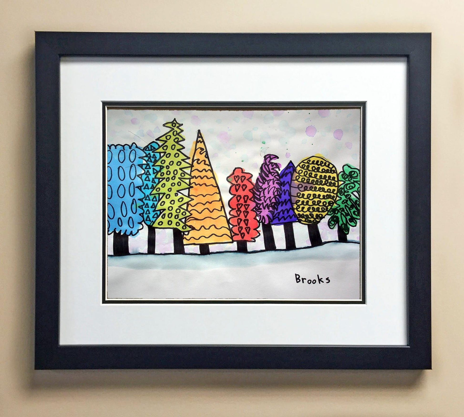 Included with the purchase is the Students Artwork, Frame, double matboard, shatter proof plexiglass, and a ready to hang backerboard with turnbuttons