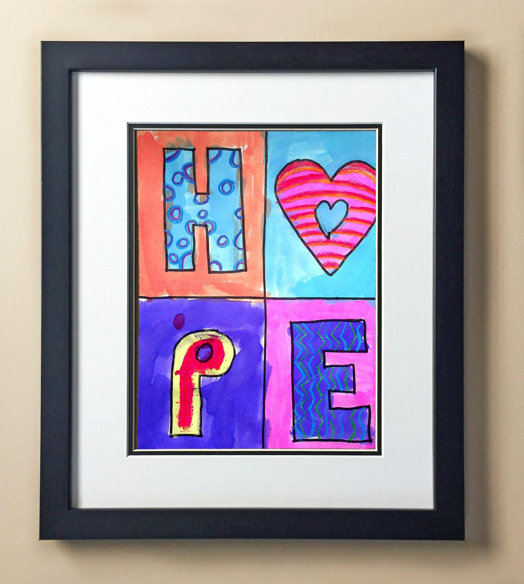 Included with the purchase is the Students Artwork, Frame, double matboard, shatter proof plexiglass, and a ready to hang backerboard with turnbuttons
