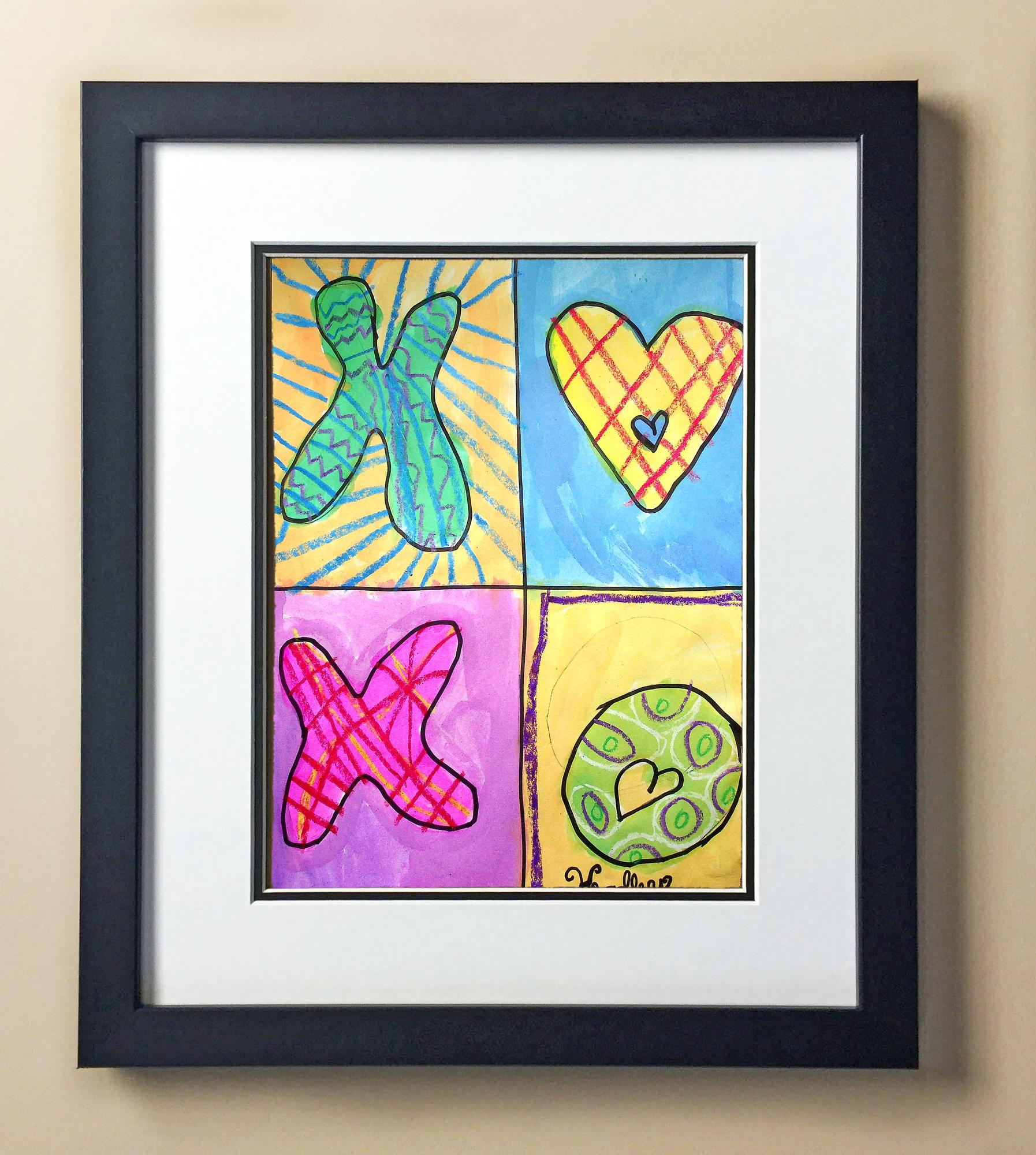 Included with the purchase is the Students Artwork, Frame, double matboard, shatter proof plexiglass, and a ready to hang backerboard with turnbuttons