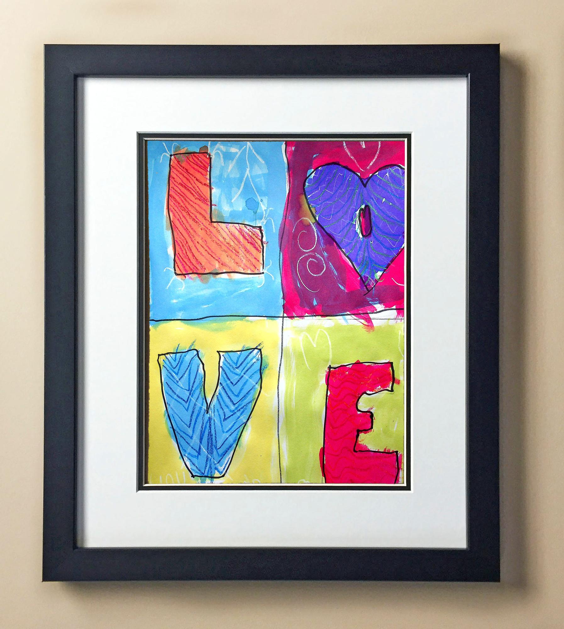 Included with the purchase is the Students Artwork, Frame, double matboard, shatter proof plexiglass, and a ready to hang backerboard with turnbuttons