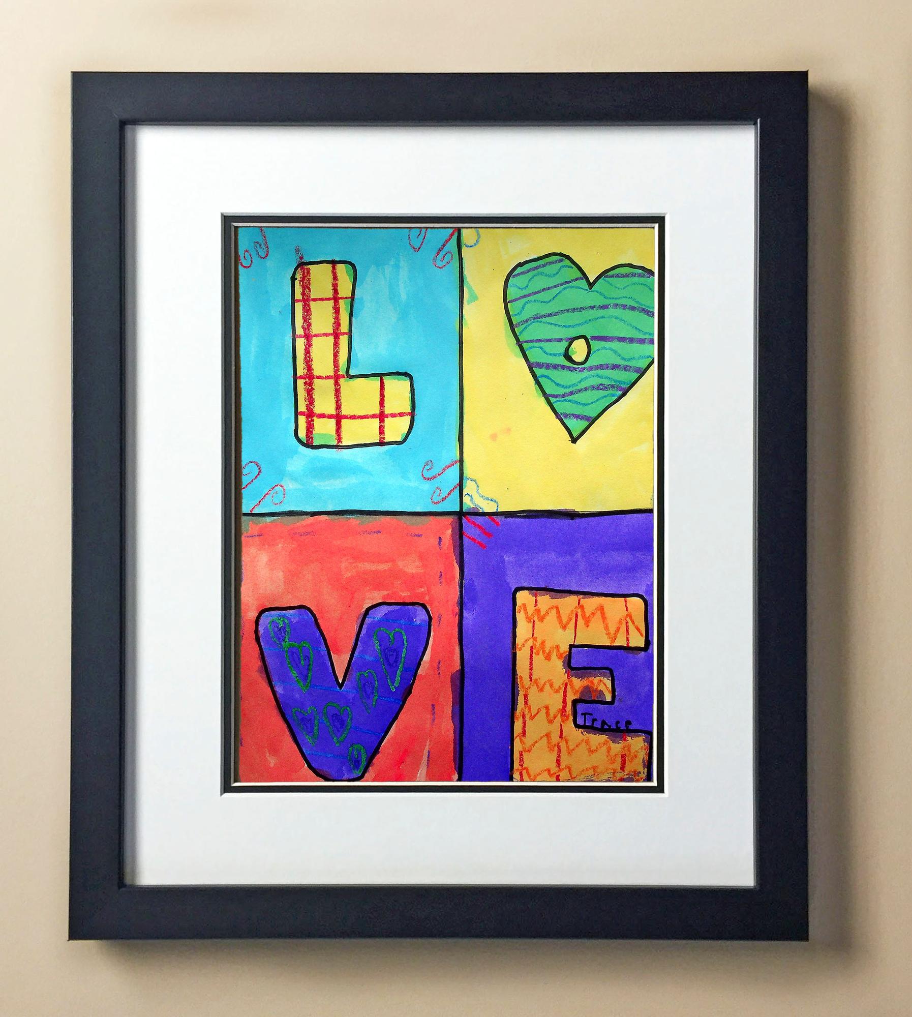 Included with the purchase is the Students Artwork, Frame, double matboard, shatter proof plexiglass, and a ready to hang backerboard with turnbuttons