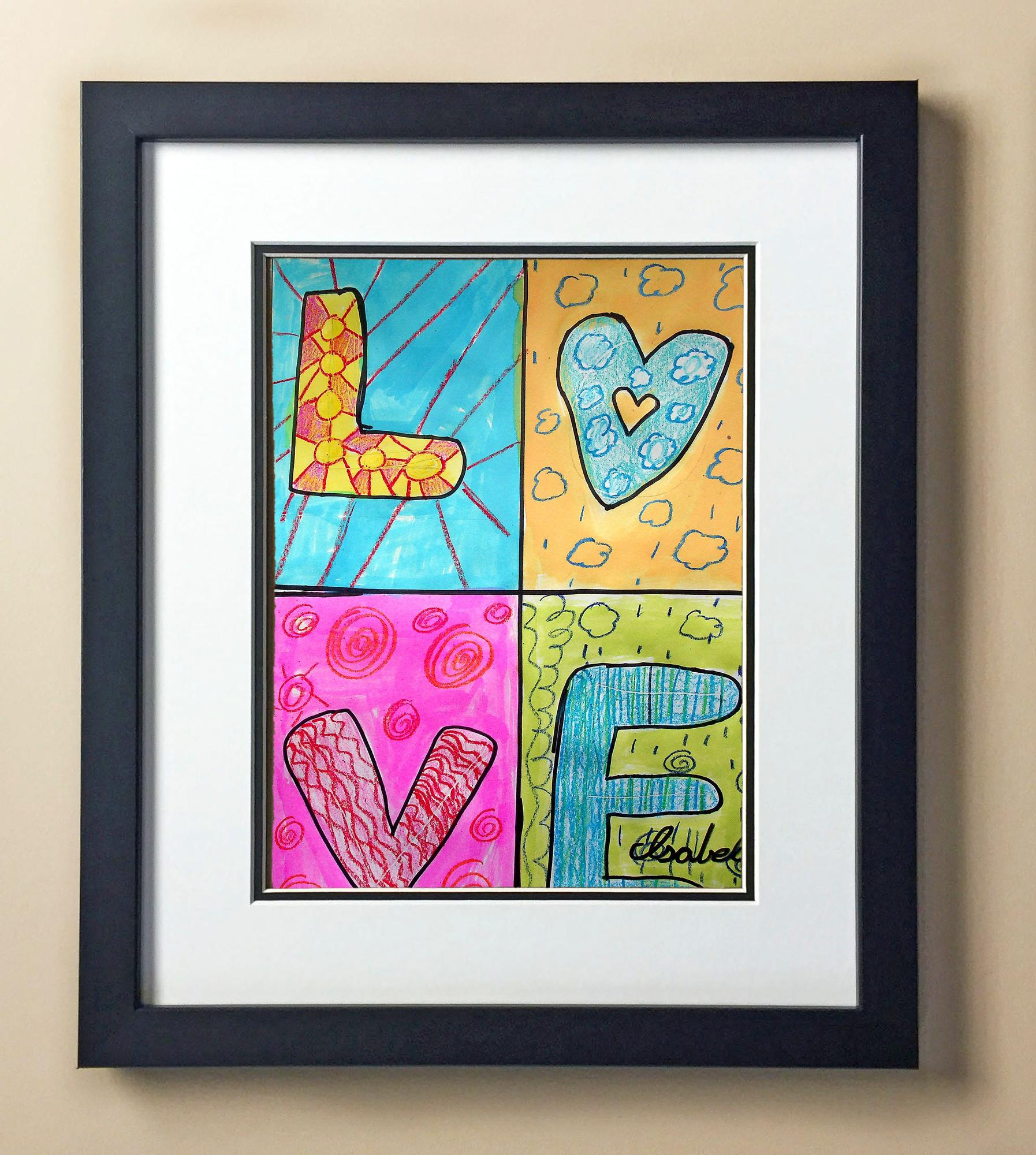 Included with the purchase is the Students Artwork, Frame, double matboard, shatter proof plexiglass, and a ready to hang backerboard with turnbuttons