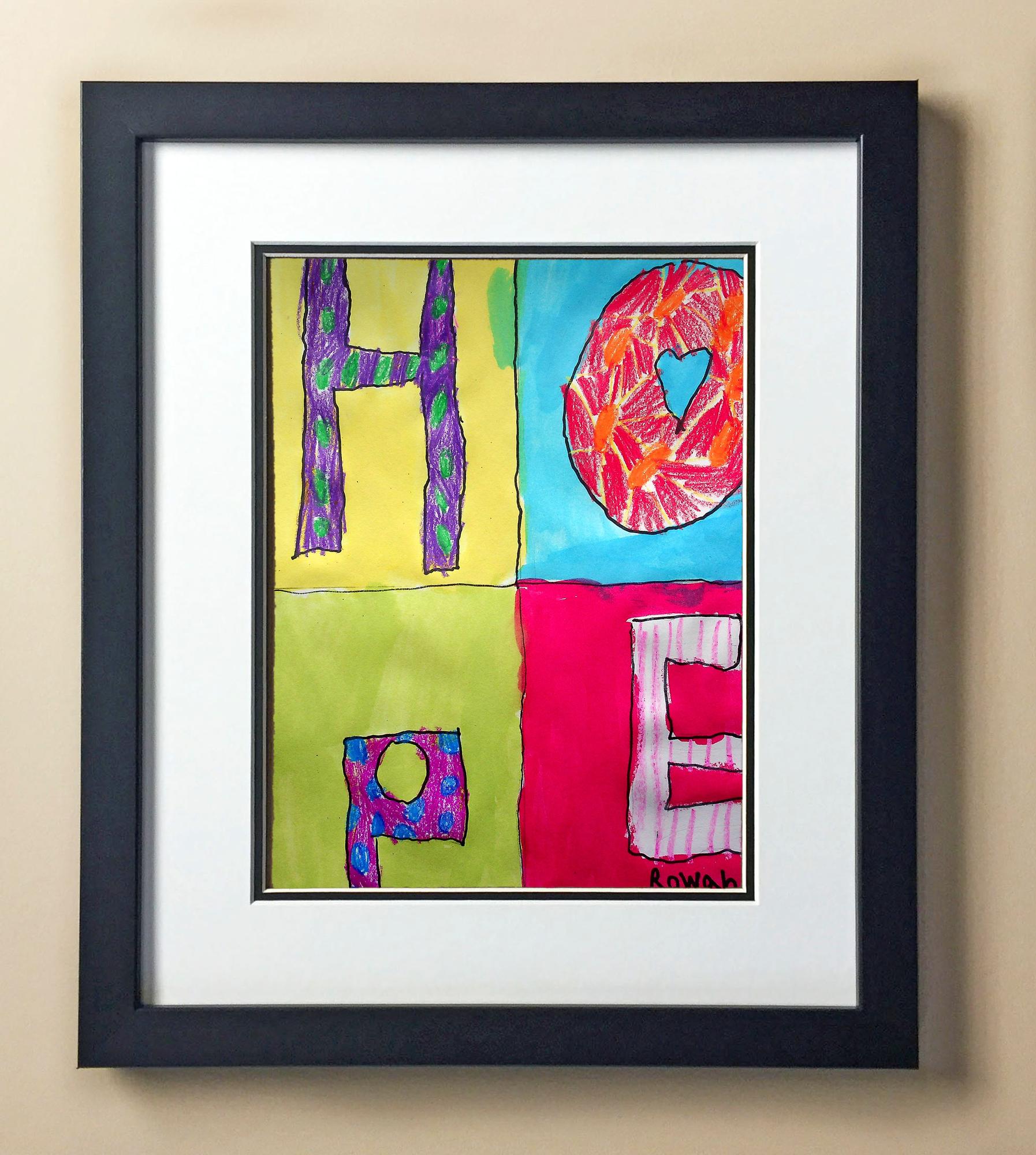 Included with the purchase is the Students Artwork, Frame, double matboard, shatter proof plexiglass, and a ready to hang backerboard with turnbuttons