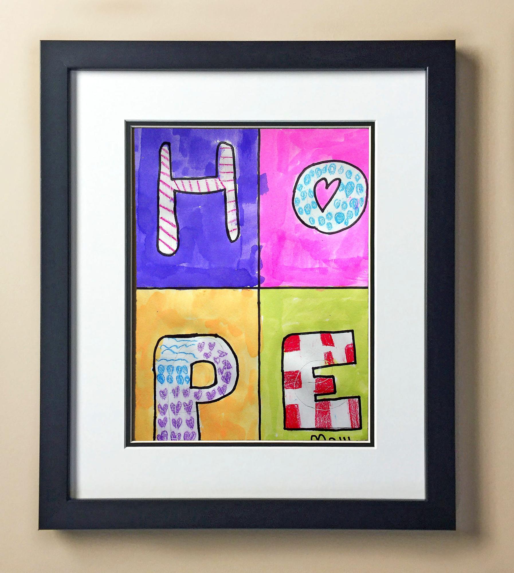 Included with the purchase is the Students Artwork, Frame, double matboard, shatter proof plexiglass, and a ready to hang backerboard with turnbuttons