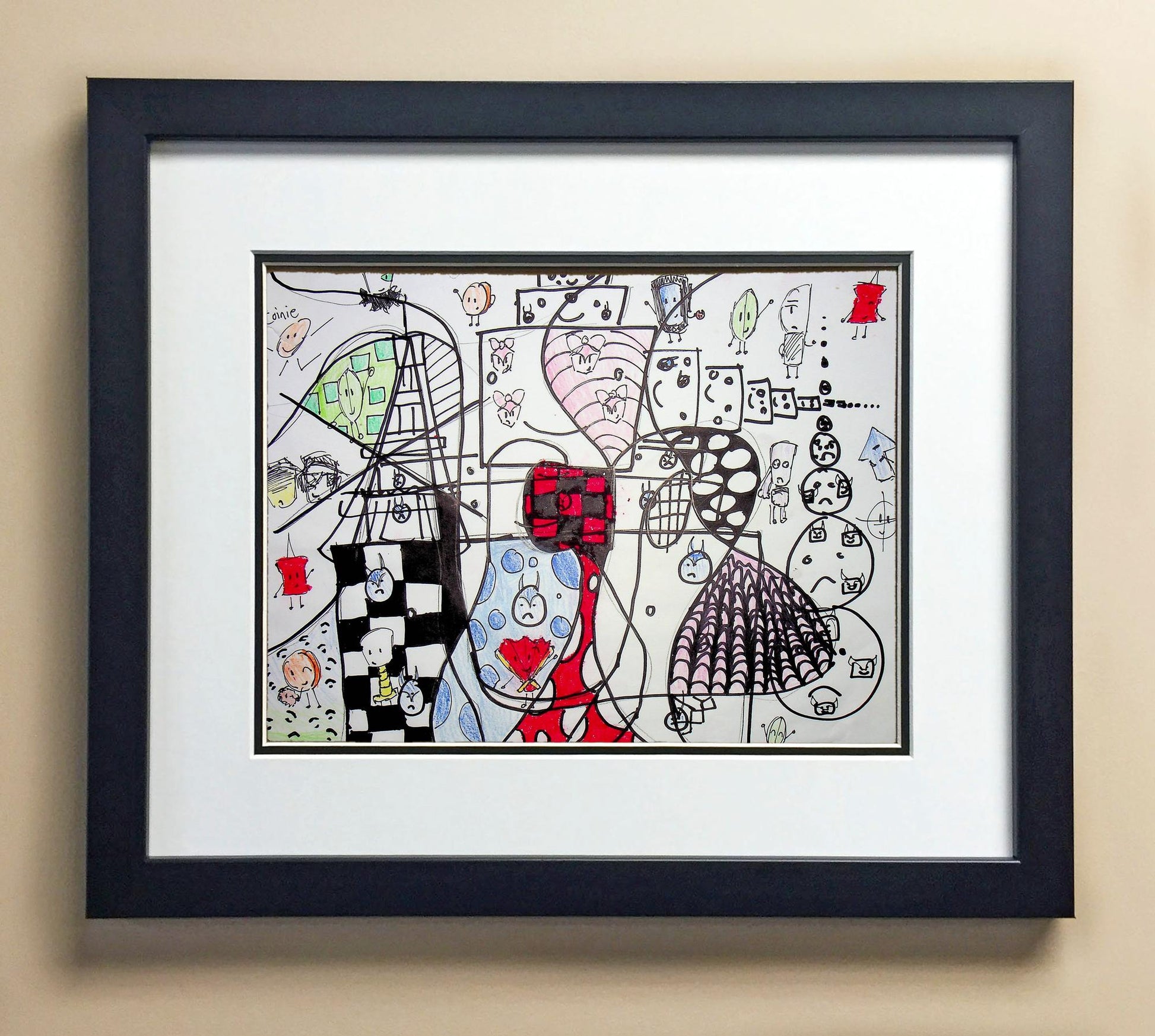 Included with the purchase is the Students Artwork, Frame, double matboard, shatter proof plexiglass, and a ready to hang backerboard with turnbuttons