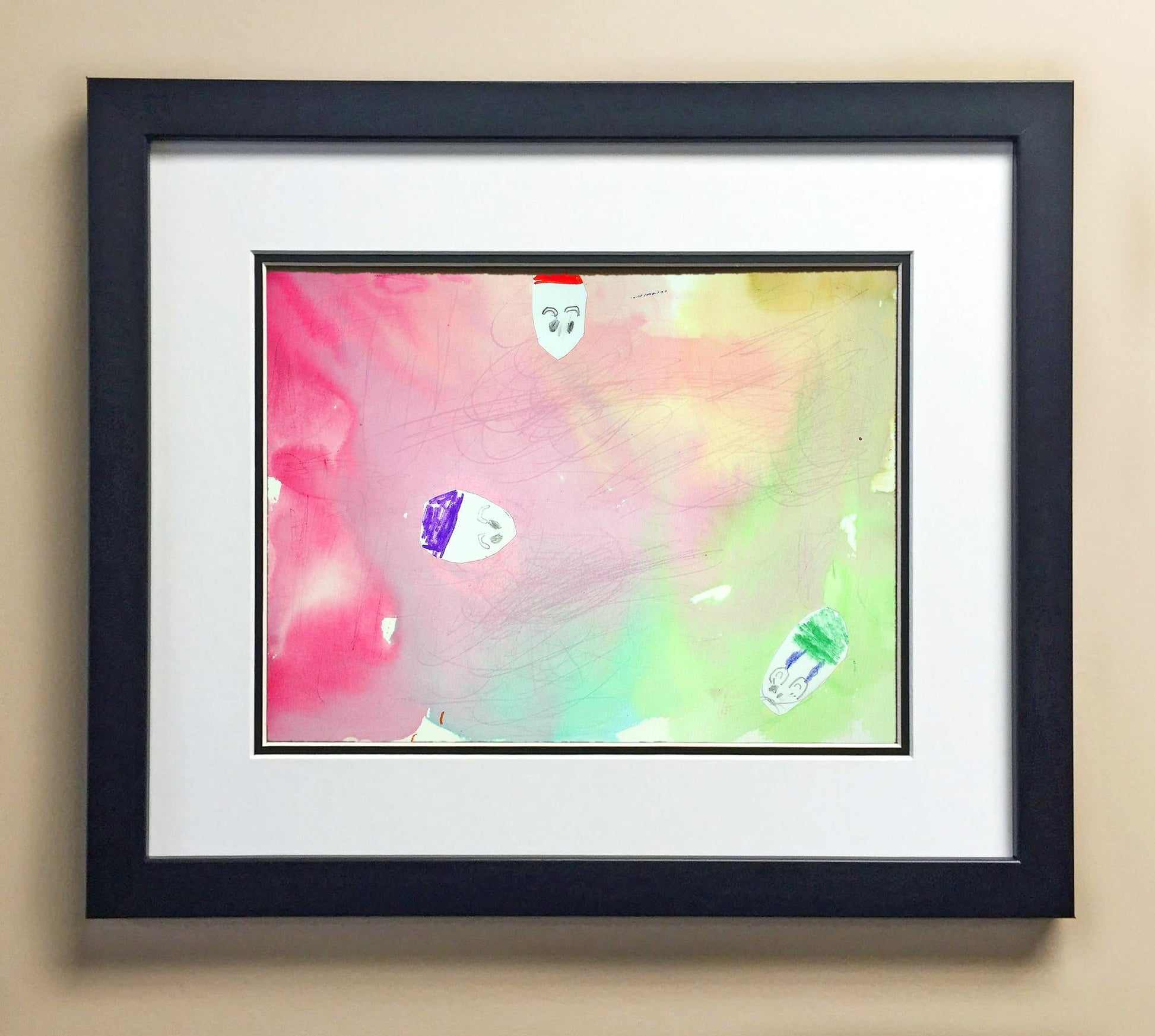 Included with the purchase is the Students Artwork, Frame, double matboard, shatter proof plexiglass, and a ready to hang backerboard with turnbuttons