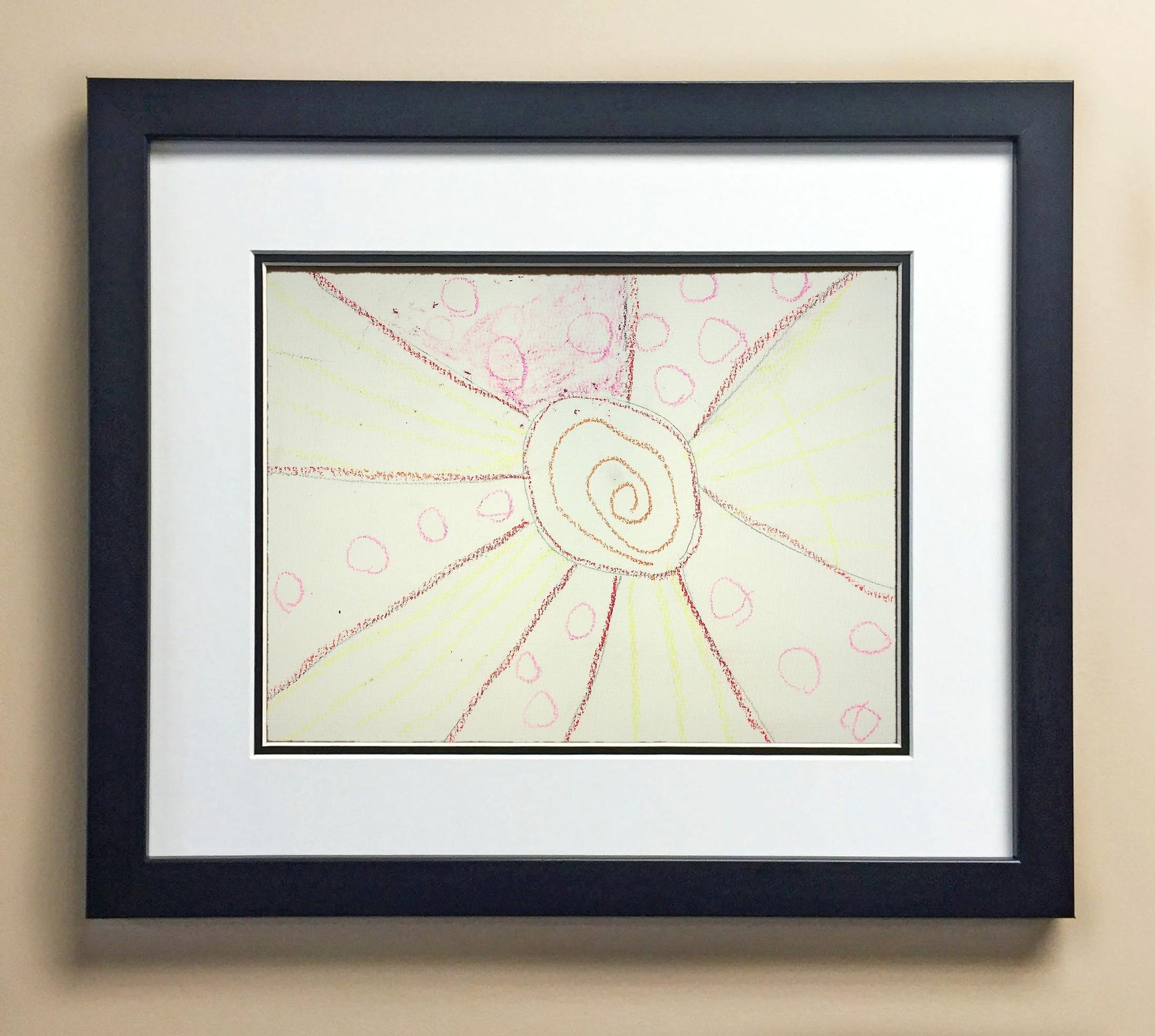 Included with the purchase is the Students Artwork, Frame, double matboard, shatter proof plexiglass, and a ready to hang backerboard with turnbuttons