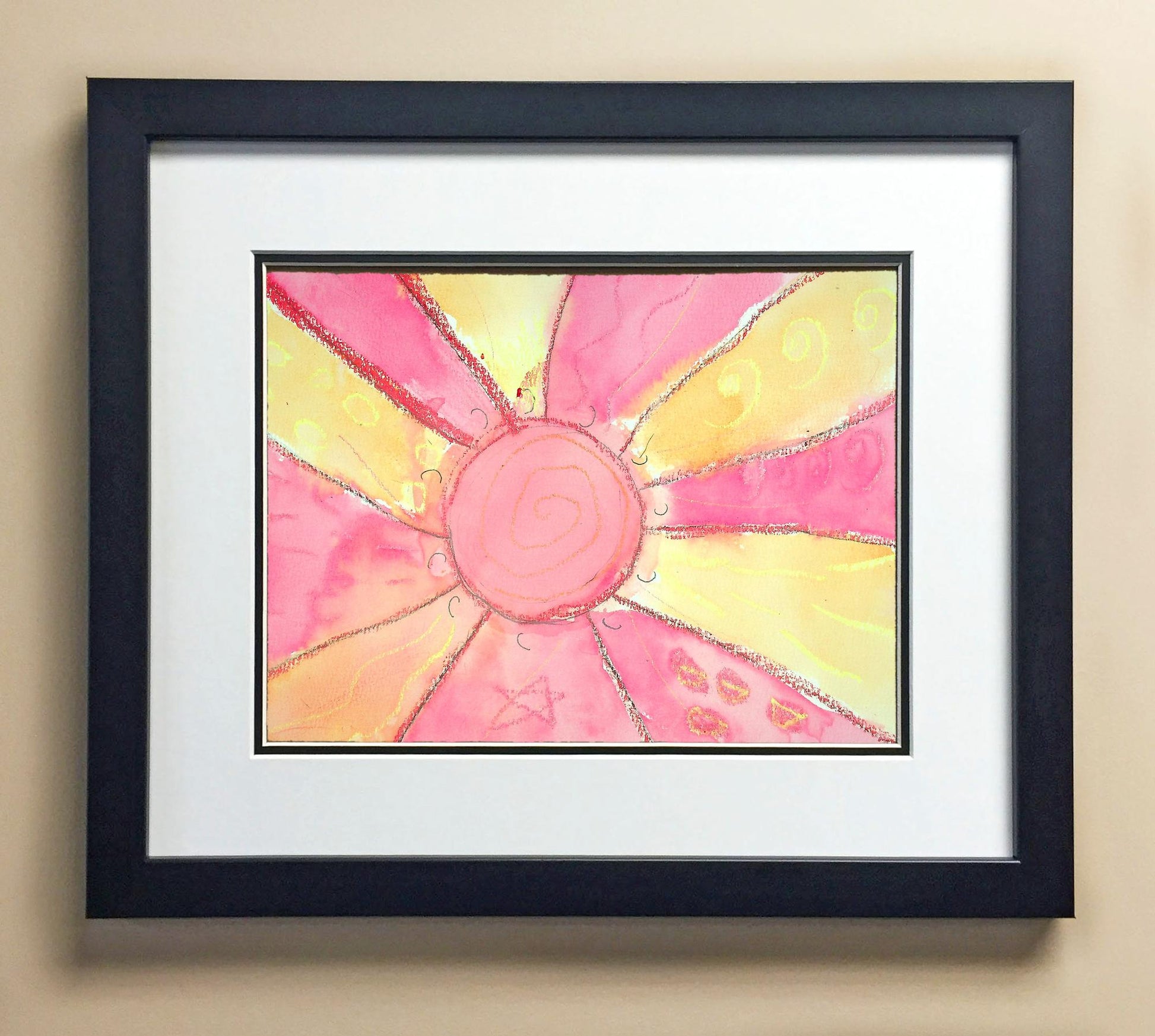 Included with the purchase is the Students Artwork, Frame, double matboard, shatter proof plexiglass, and a ready to hang backerboard with turnbuttons