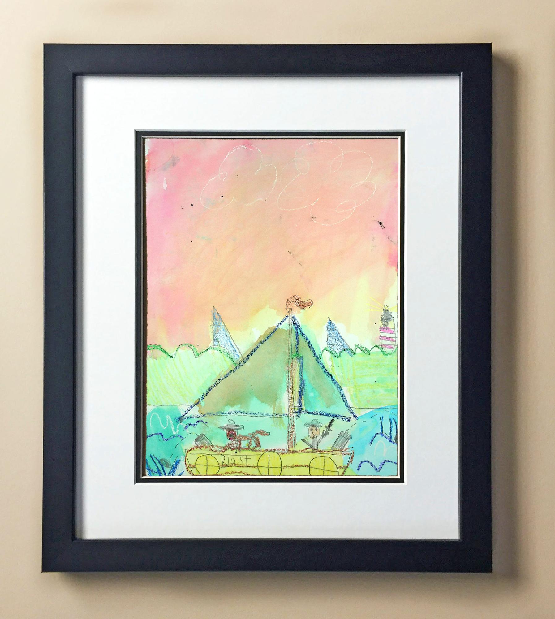 Included with the purchase is the Students Artwork, Frame, double matboard, shatter proof plexiglass, and a ready to hang backerboard with turnbuttons