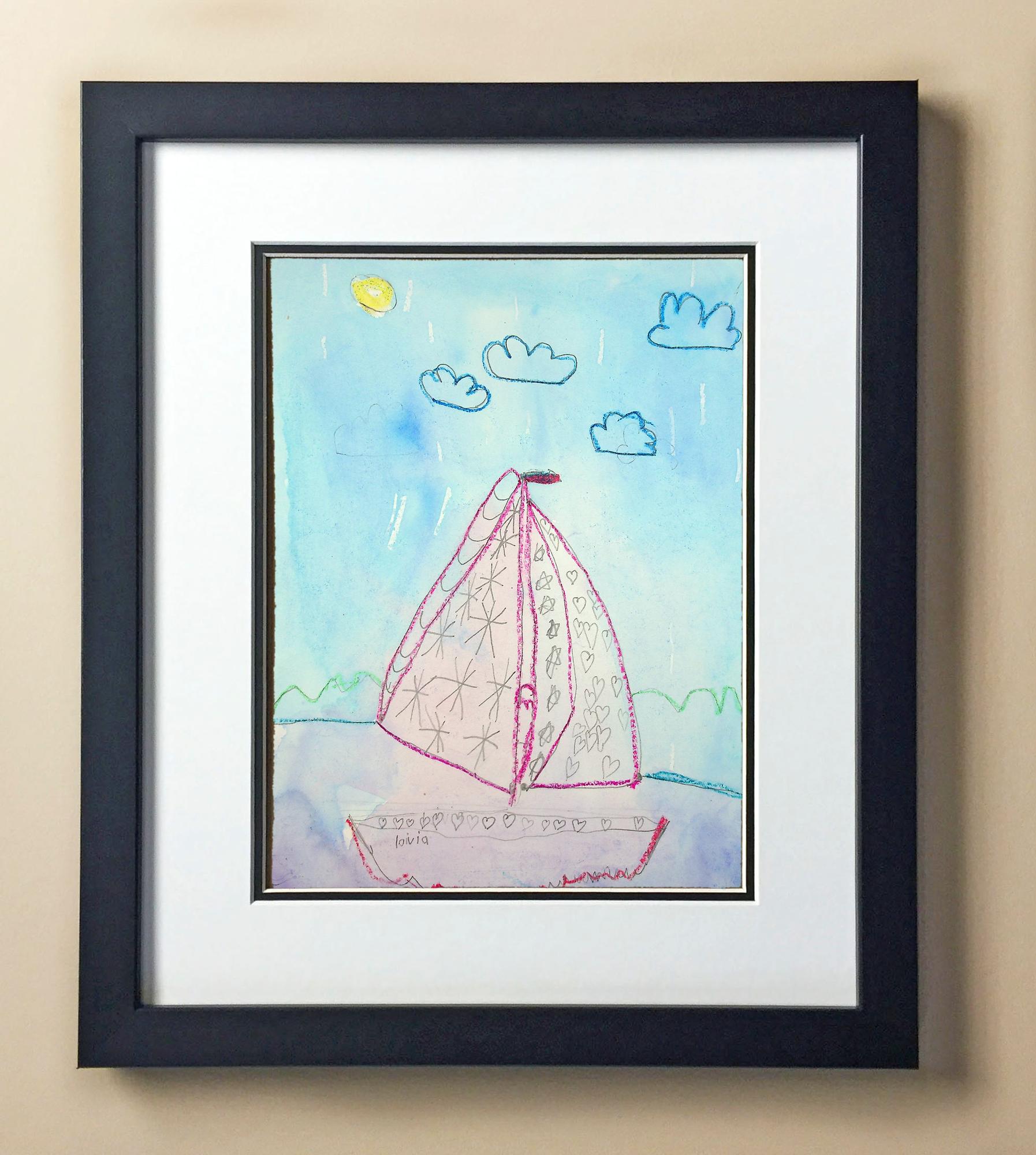 Included with the purchase is the Students Artwork, Frame, double matboard, shatter proof plexiglass, and a ready to hang backerboard with turnbuttons