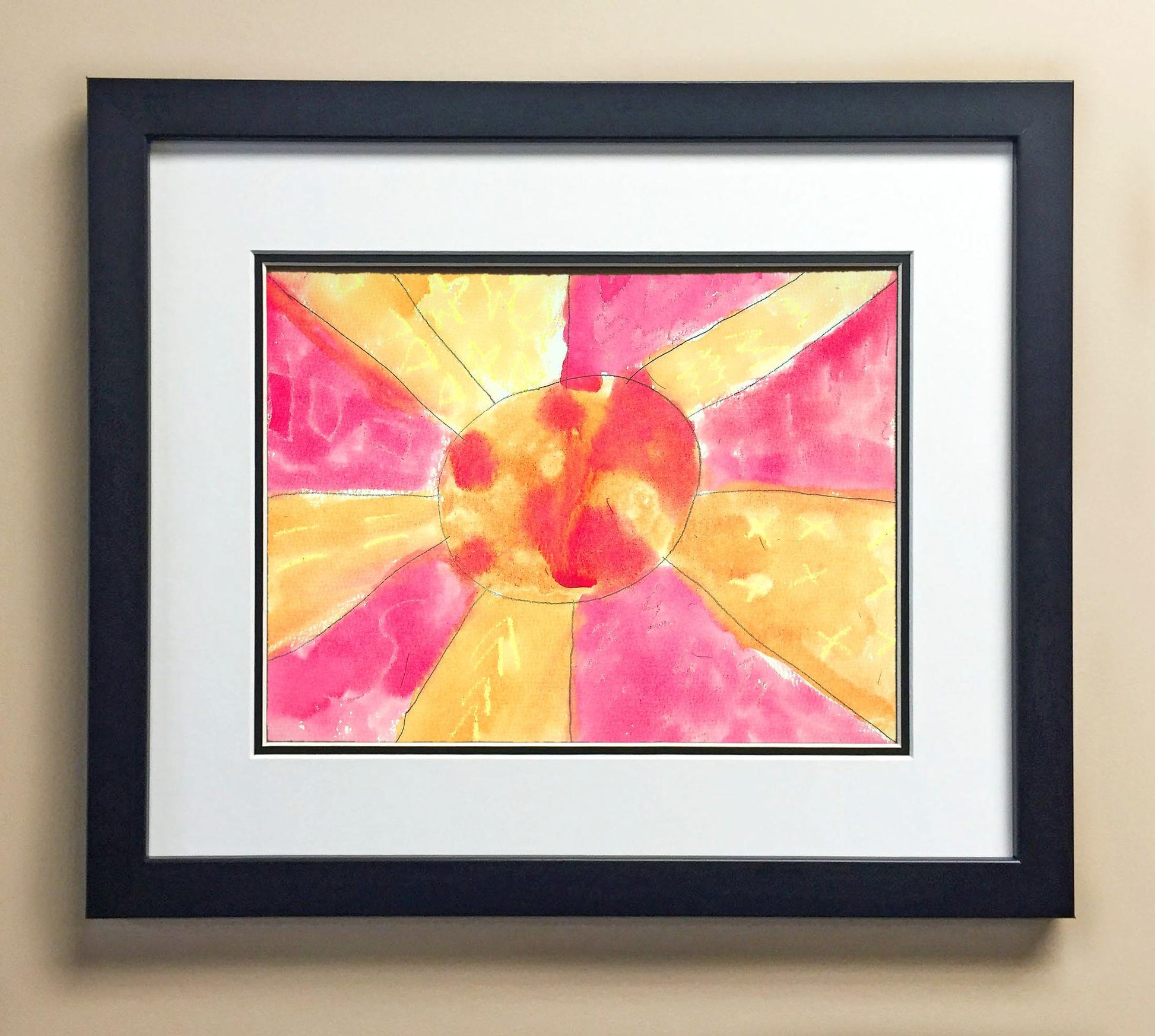 Included with the purchase is the Students Artwork, Frame, double matboard, shatter proof plexiglass, and a ready to hang backerboard with turnbuttons