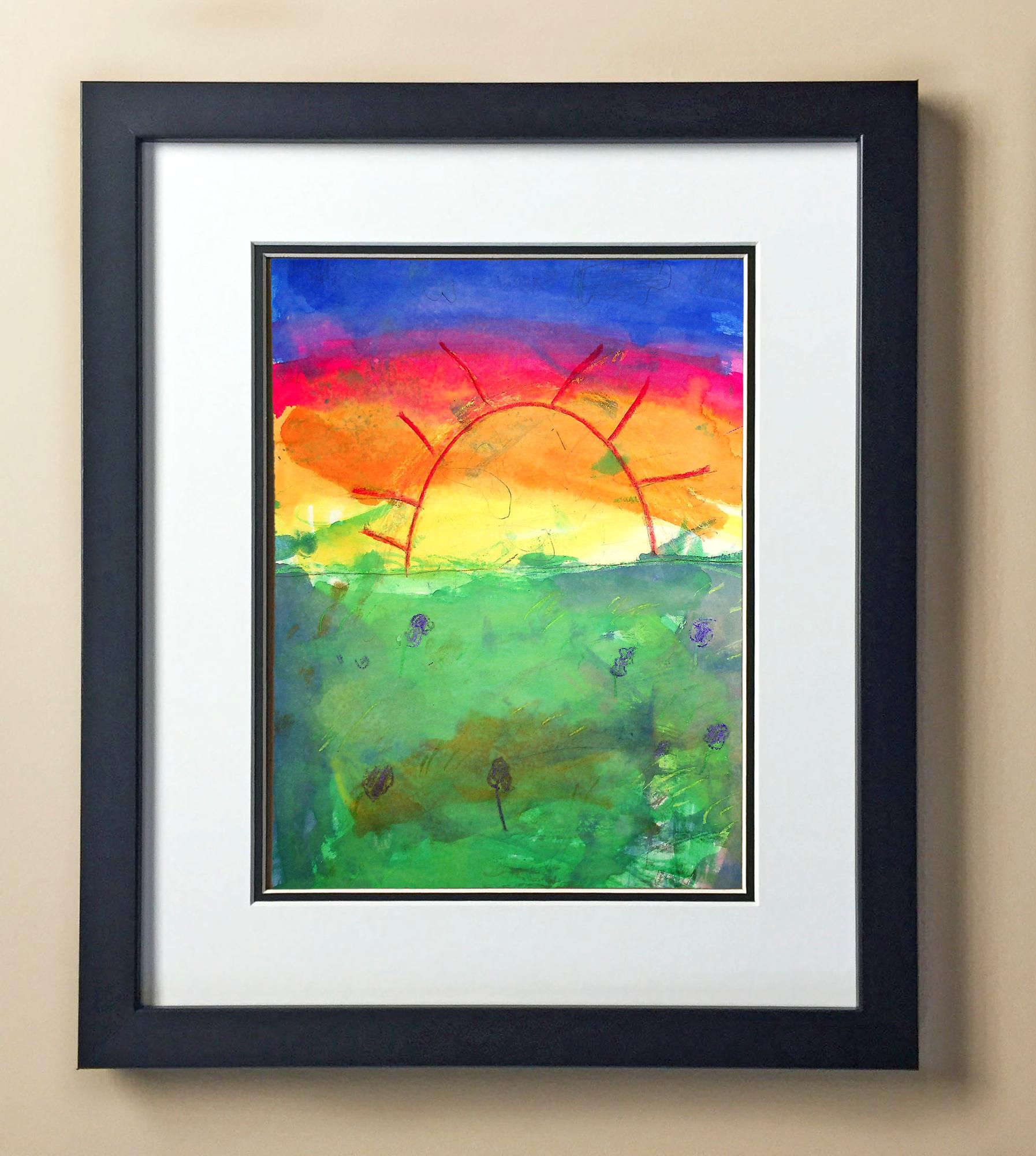 Included with the purchase is the Students Artwork, Frame, double matboard, shatter proof plexiglass, and a ready to hang backerboard with turnbuttons