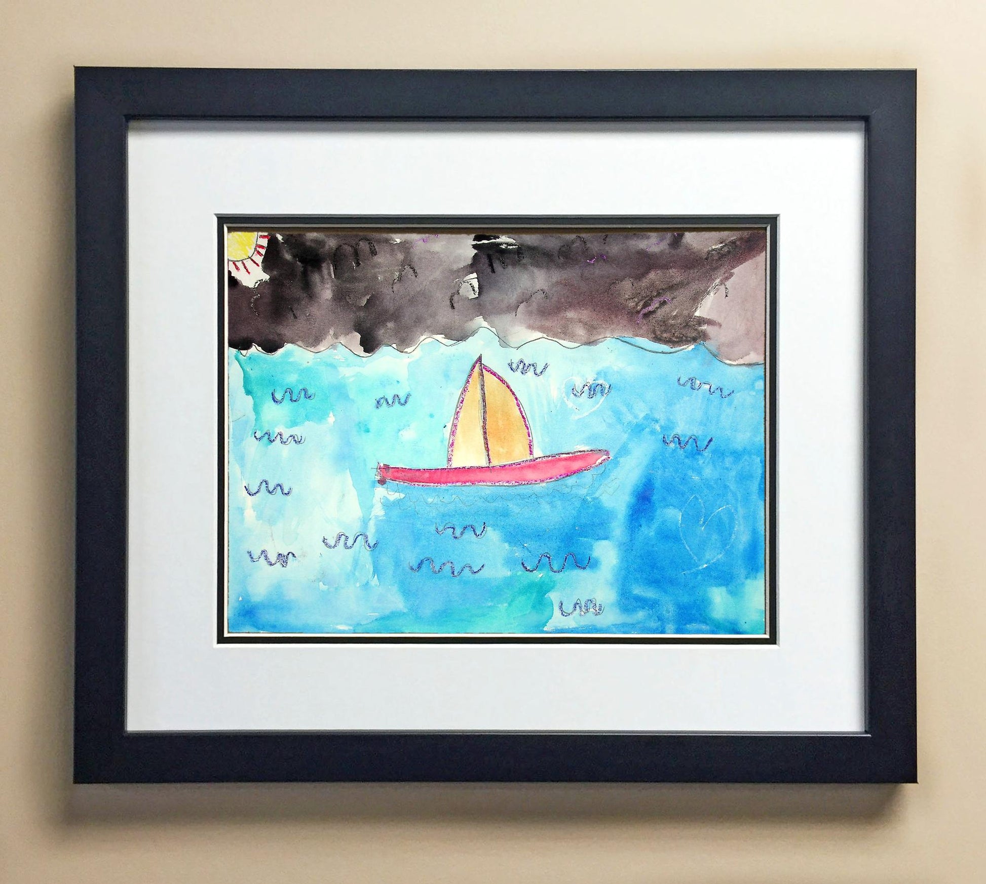 Included with the purchase is the Students Artwork, Frame, double matboard, shatter proof plexiglass, and a ready to hang backerboard with turnbuttons