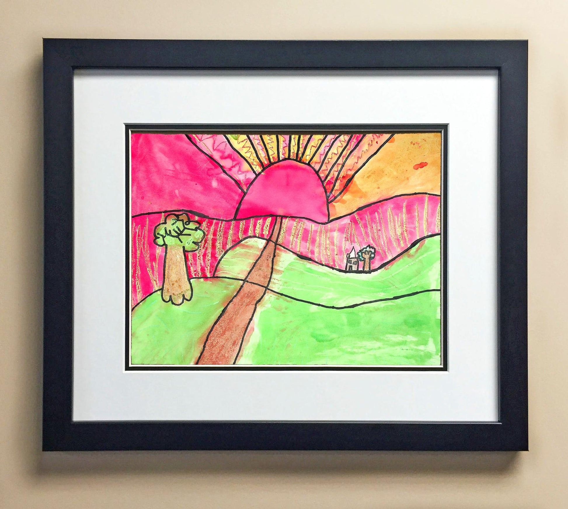Included with the purchase is the Students Artwork, Frame, double matboard, shatter proof plexiglass, and a ready to hang backerboard with turnbuttons