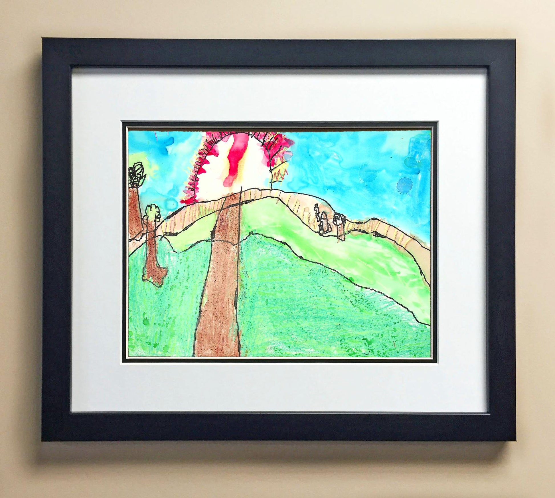 Included with the purchase is the Students Artwork, Frame, double matboard, shatter proof plexiglass, and a ready to hang backerboard with turnbuttons