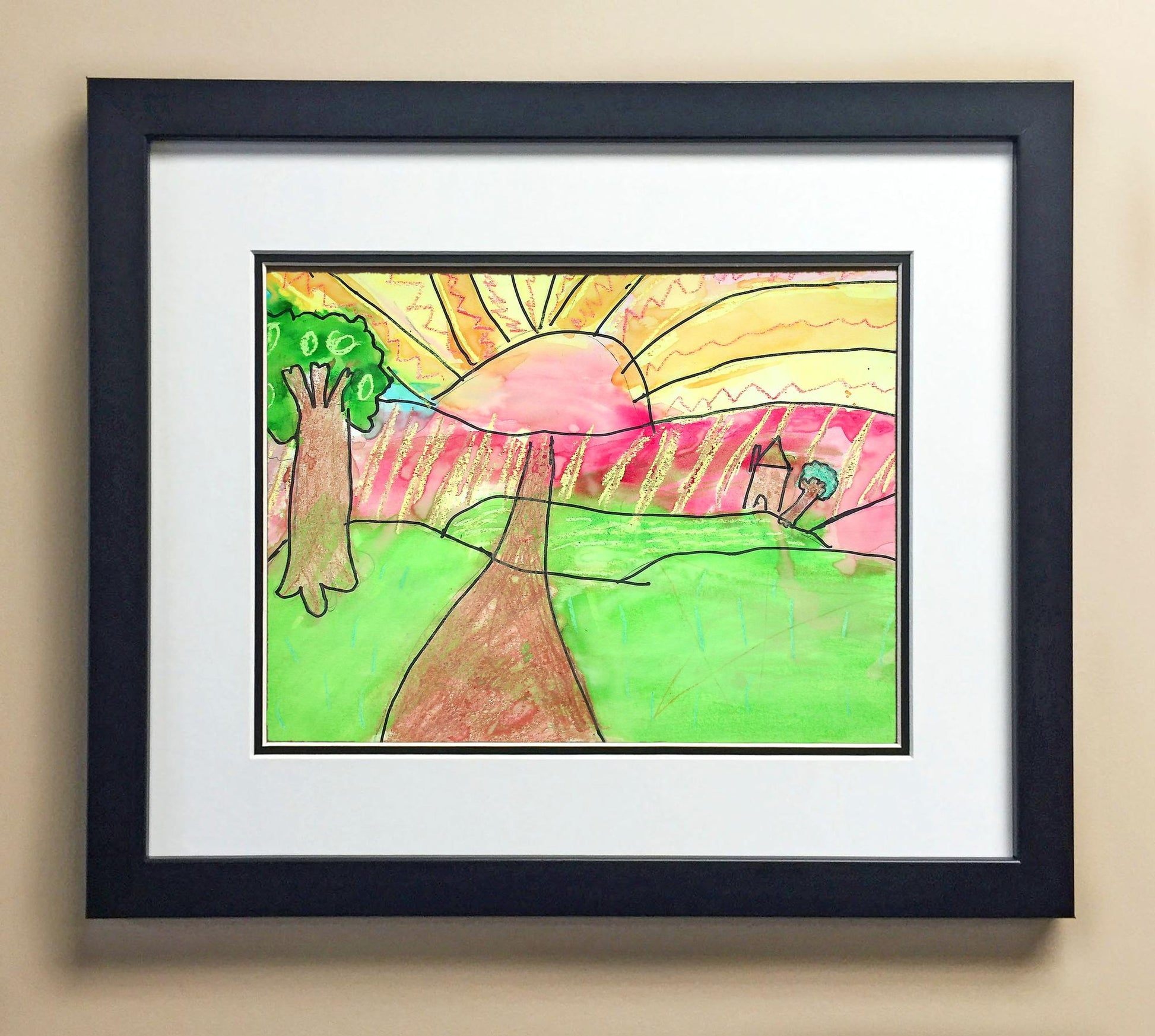 Included with the purchase is the Students Artwork, Frame, double matboard, shatter proof plexiglass, and a ready to hang backerboard with turnbuttons